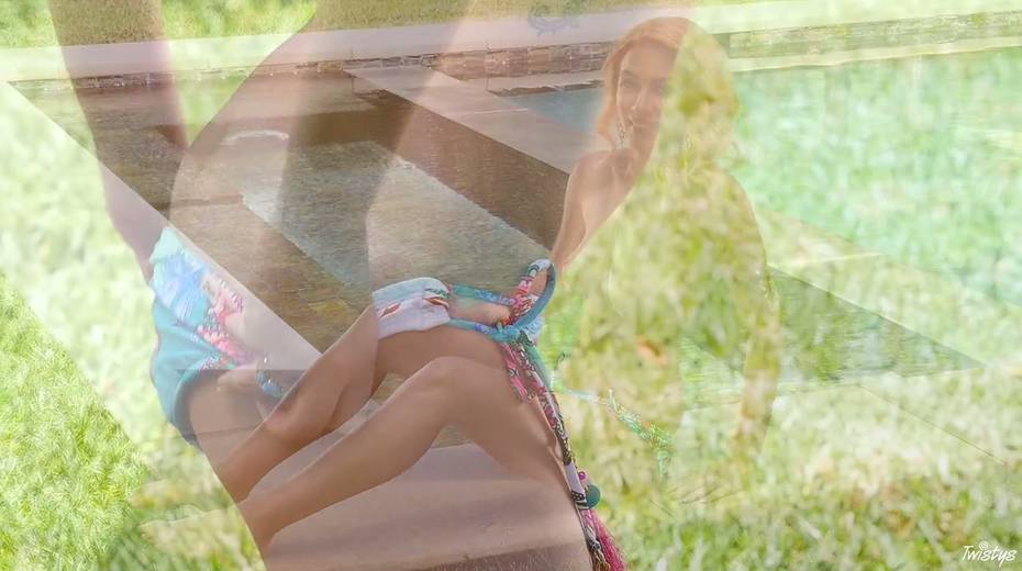 Lecherous red haired actress Penelope Lynn strips and fucks herself by the pool side