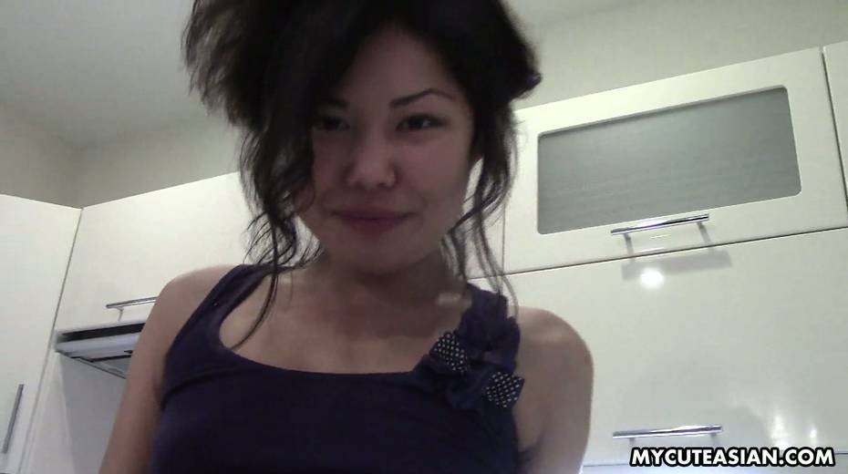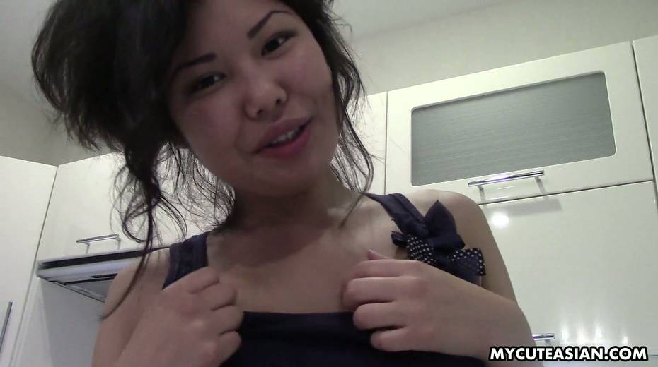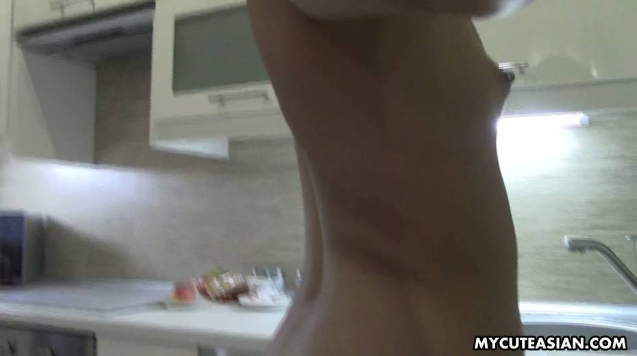 Slim chick shows her twat and plays with small Asian tits