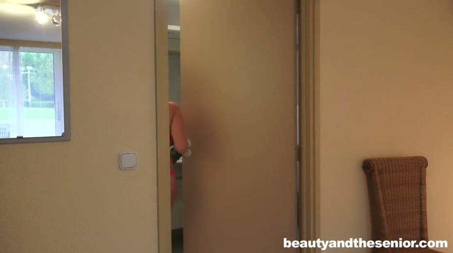 Young beautiful gal and old man are having sex in the toilet room