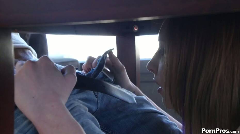 Horny chick Katy Kiss swallows dick under the table
