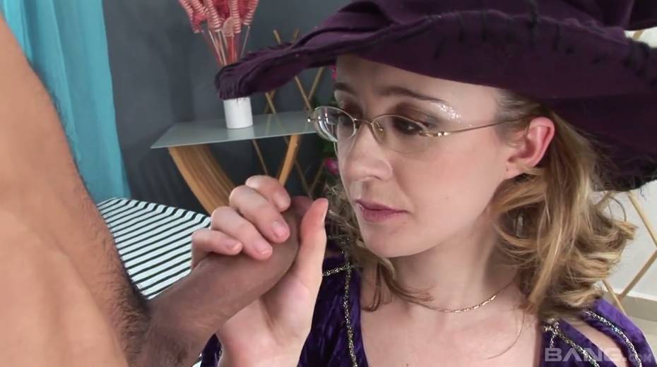 Young witch with very hairy twat Kitty takes cumshots on her glasses