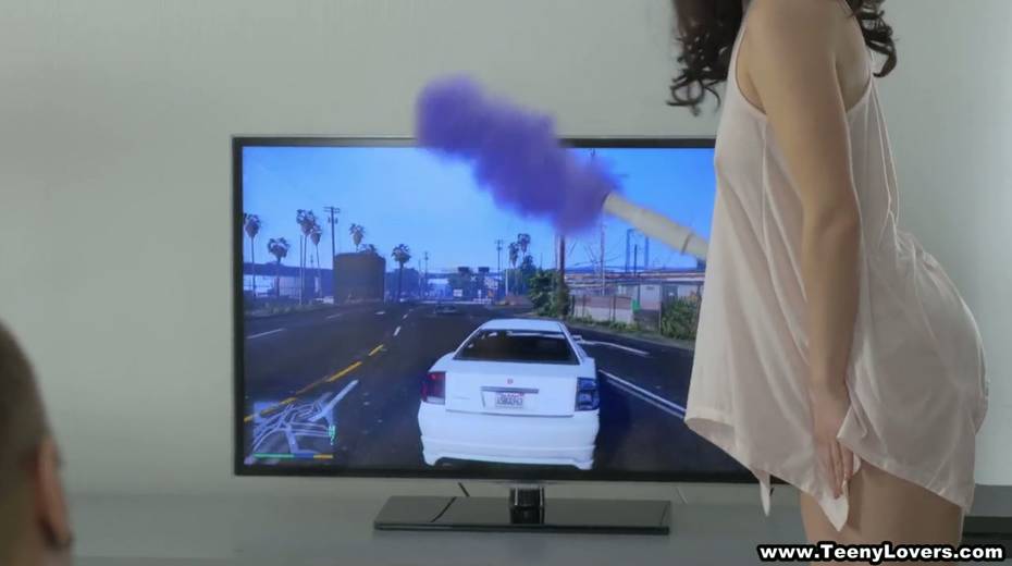 Seductive teen shows her ass to gamer and he fucks her anal hole
