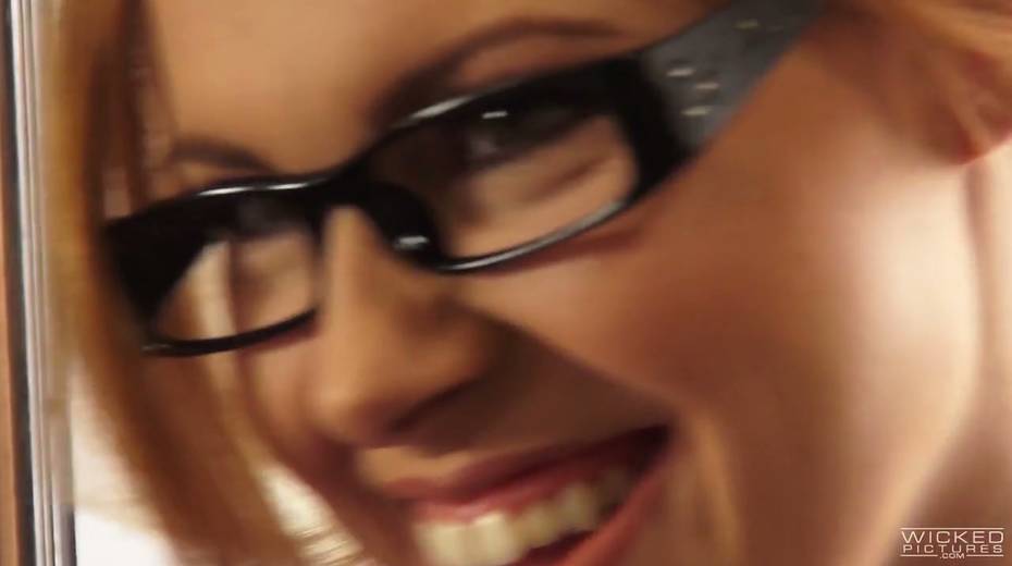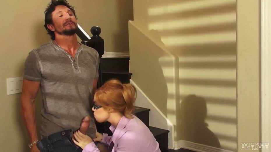 Red head in glasses Edyn Blair gives blowjob and gets rammed on the stairs