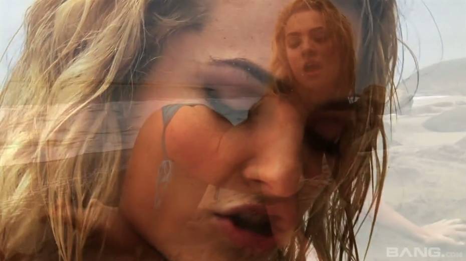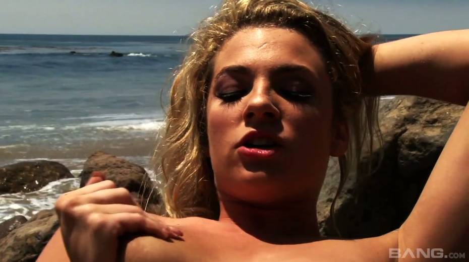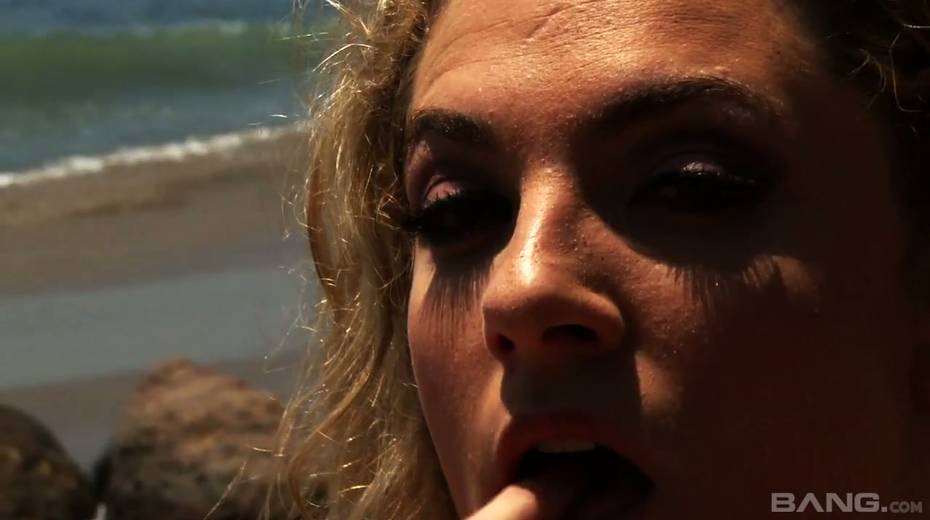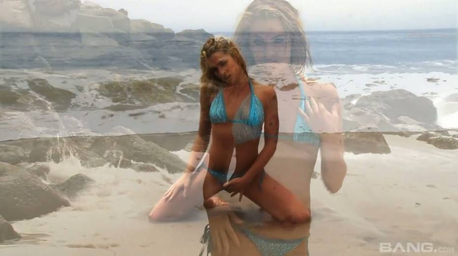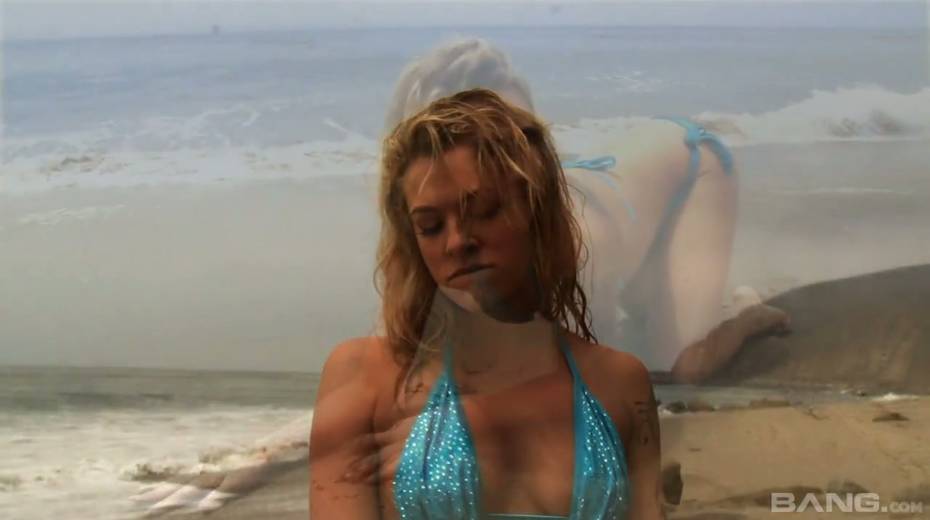 Gorgeous porn model in bikini Bailey Blue is fucking herself on the beach