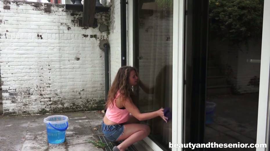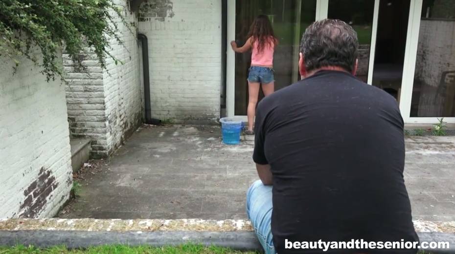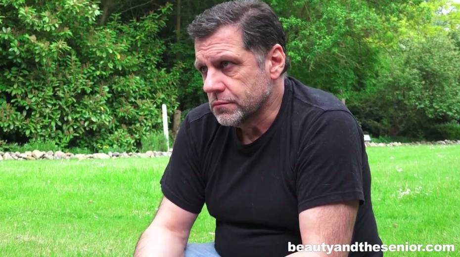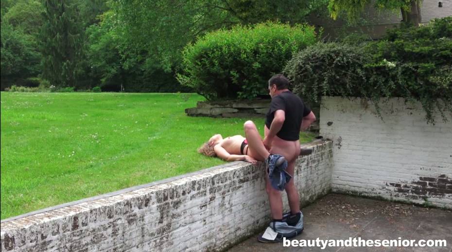 Old dude fucks pretty young chick Bunny Babe right on the lawn