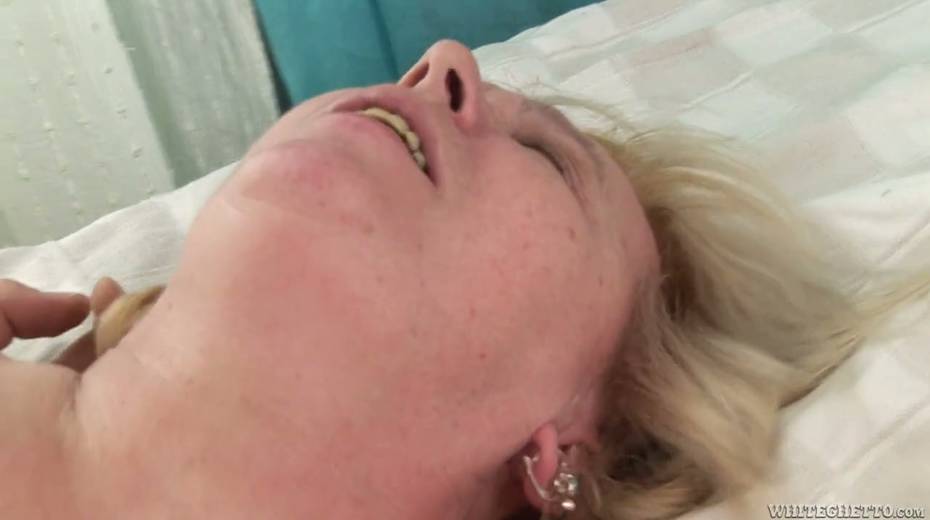 Horny old bitch Suzi enjoys sucking hard dick and takes cum in her worn out twat