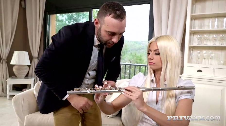 Fabulous blond flutist Jessie Volt shows blowjob master class and gets double penetrated