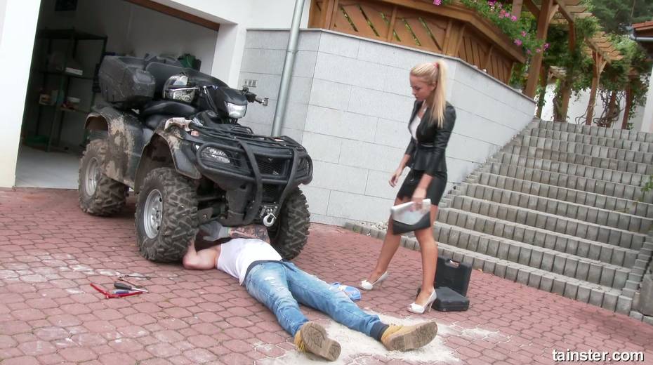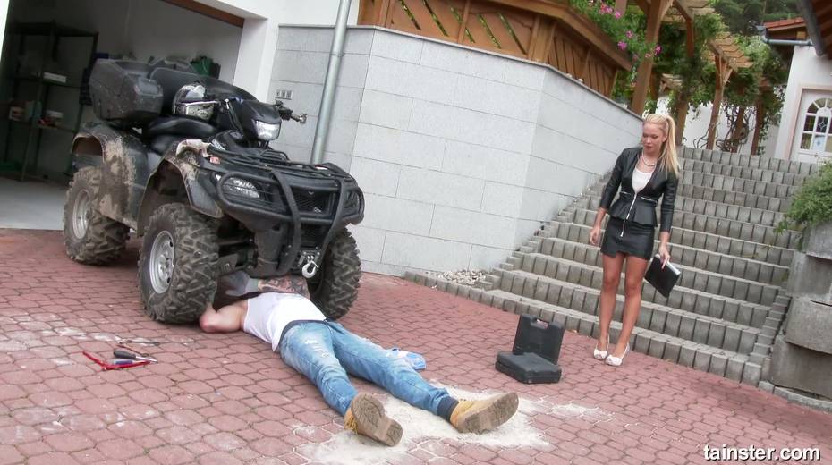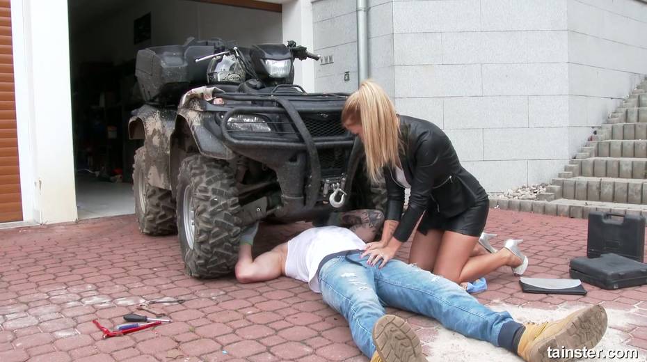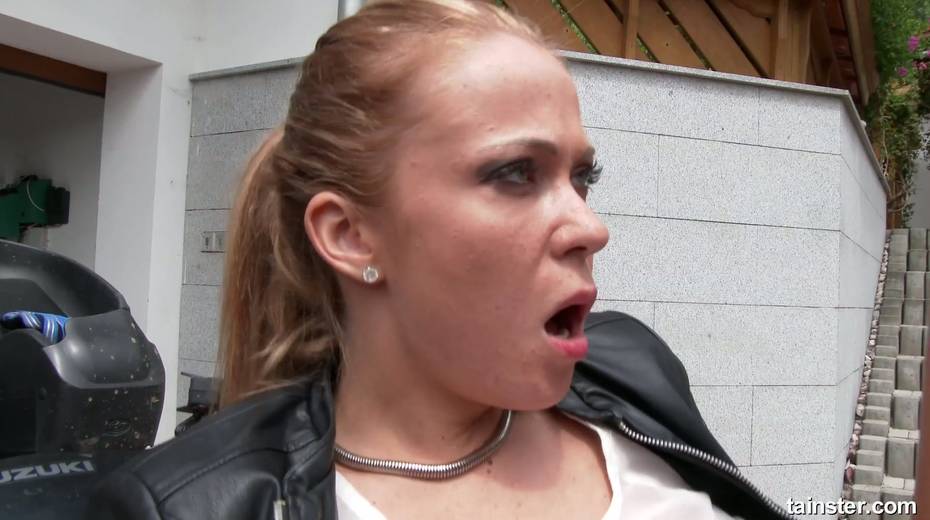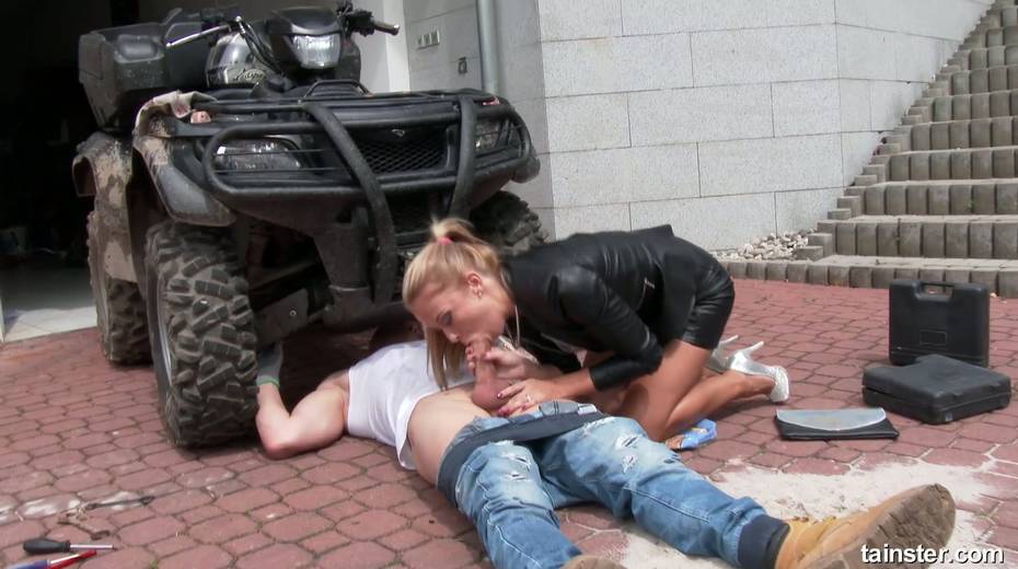 Nasty chick Angella Christin is sucking dick and riding it reverse outdoor