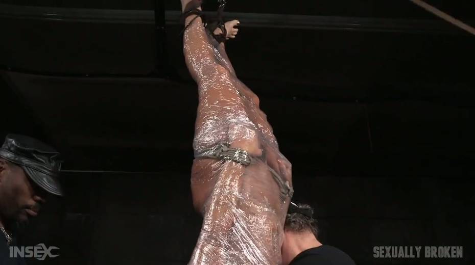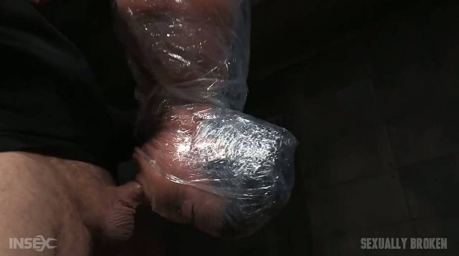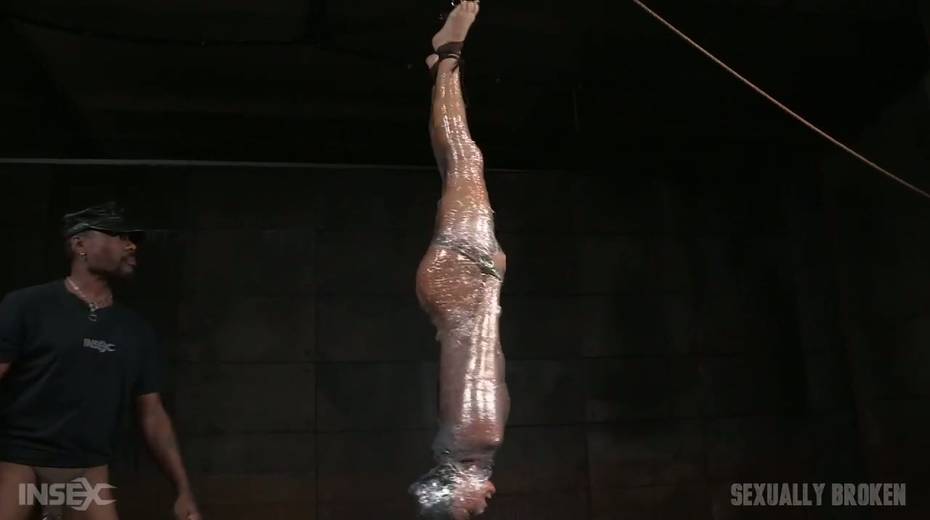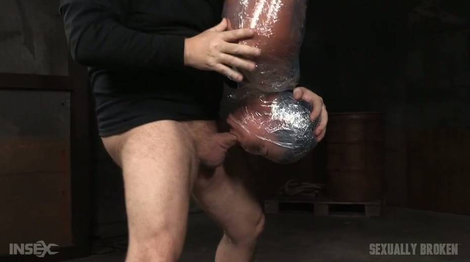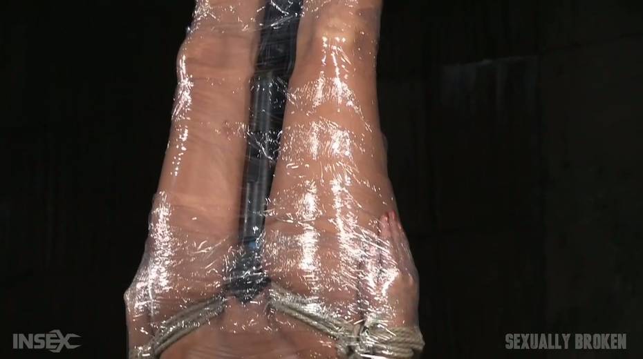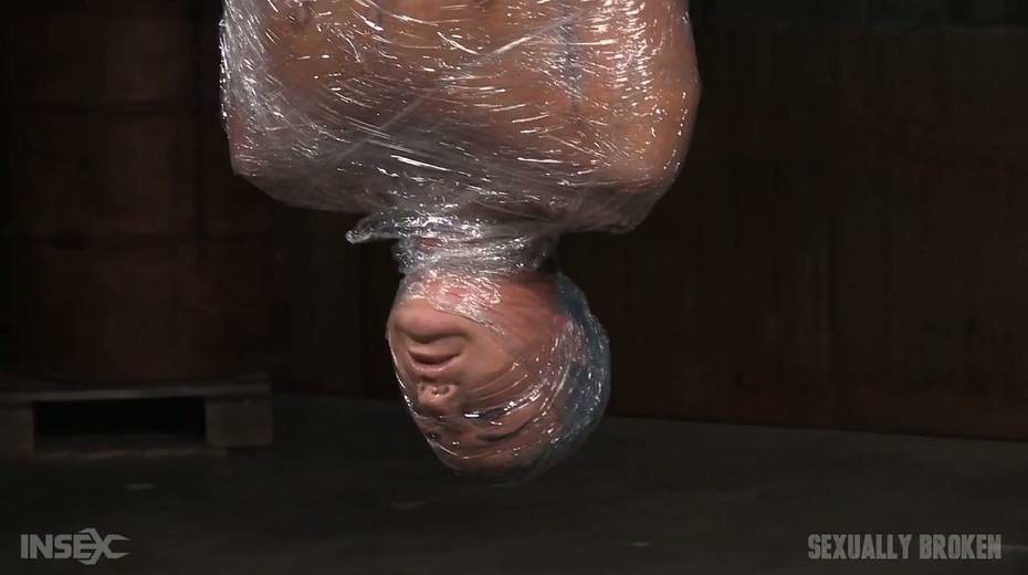 Dude fucks face of suspended bitch London River covered with plastic warp