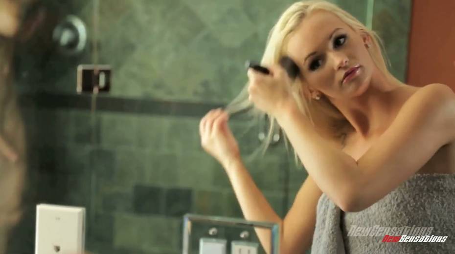 Cute blondie Emily Austin swallows thick pole and gets fucked in front of the mirror in the bathroom