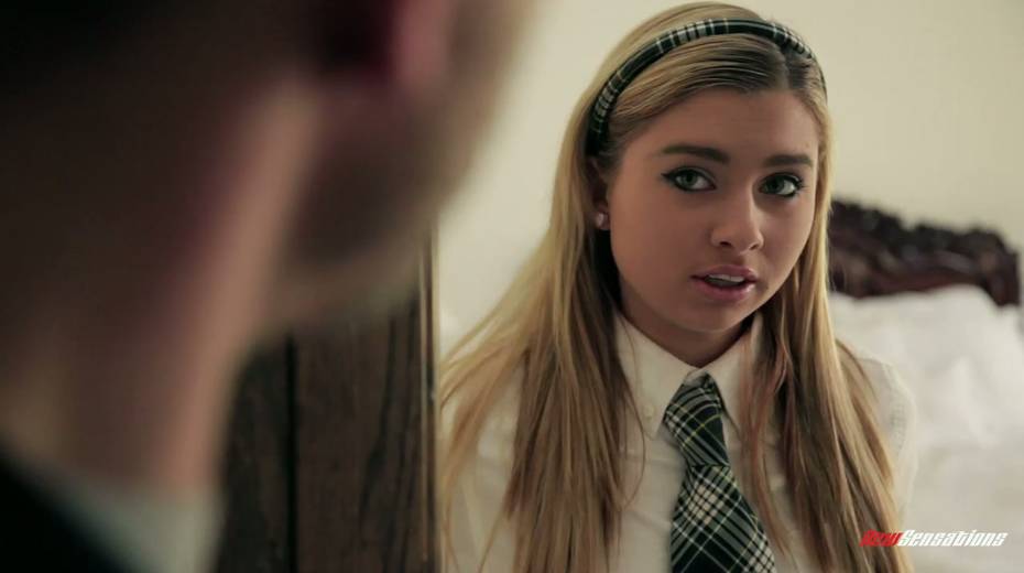 Cute college chick Molly Bennett takes cumshots in her opened mouth