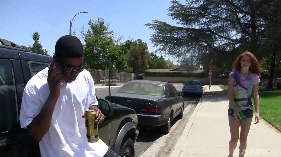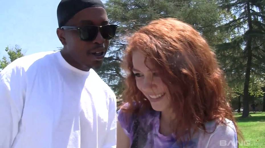 Petite red haired girl Alice Green sucks giant black hose and takes cum in her mouth