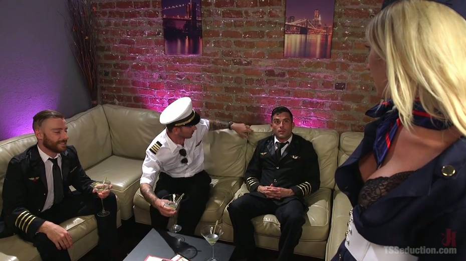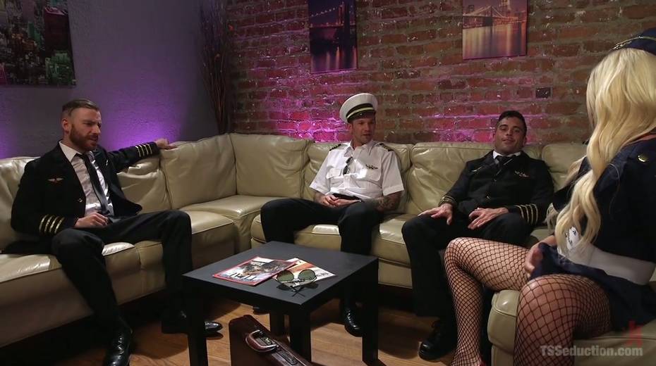 Big tittied shemale stewardess is fucked by horny pilots
