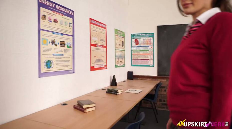 Sizzling student Laura shows upskirt sitting on the table