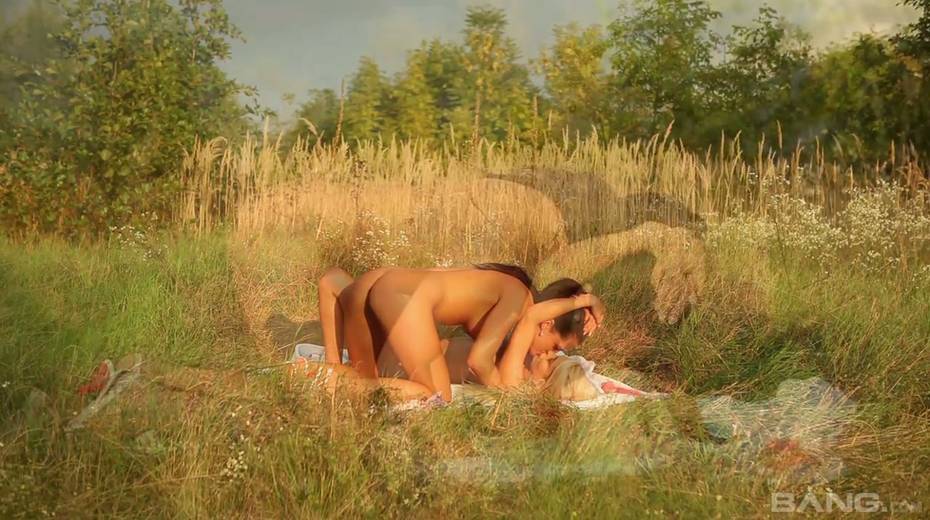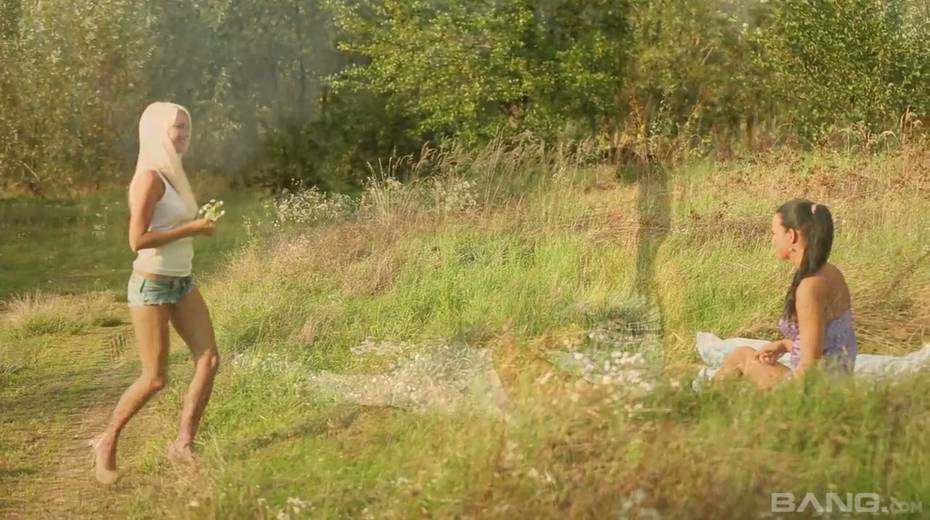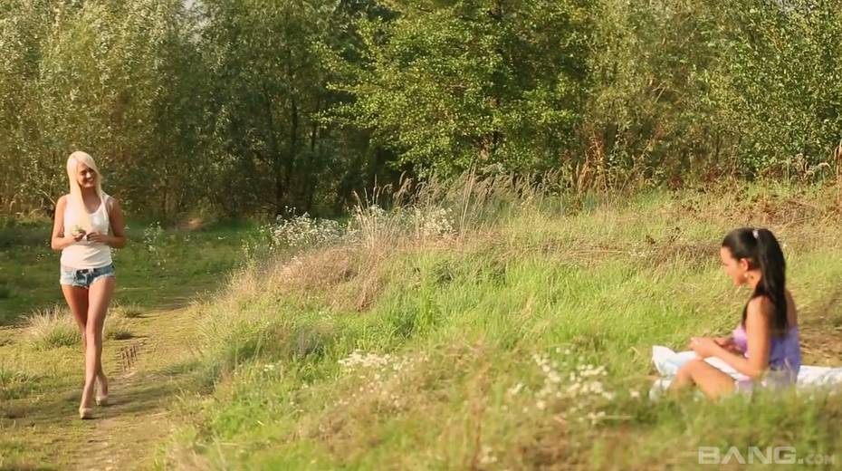 Two sensual babes lick each others tasty looking pussies outdoor