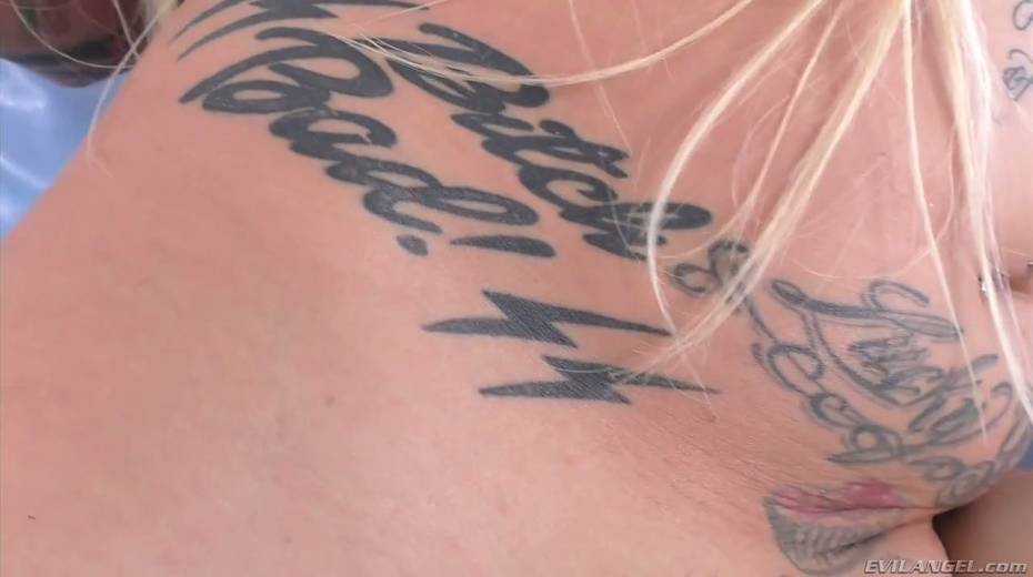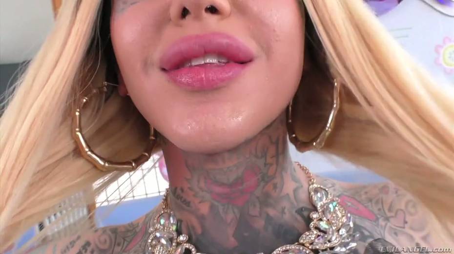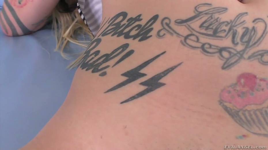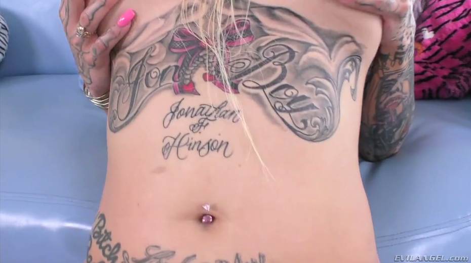 Tattooed ladyboy Britney Boykins is playing with dildo and jerking off dick