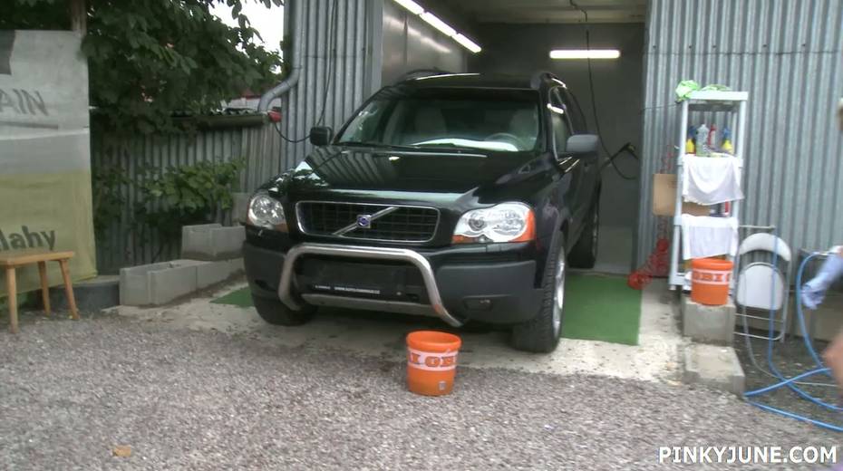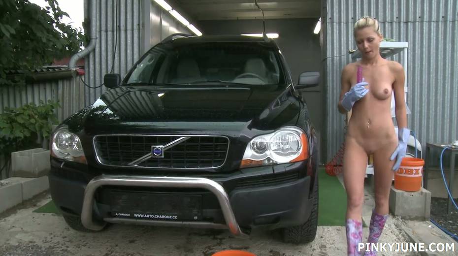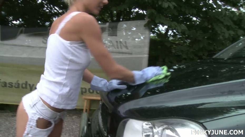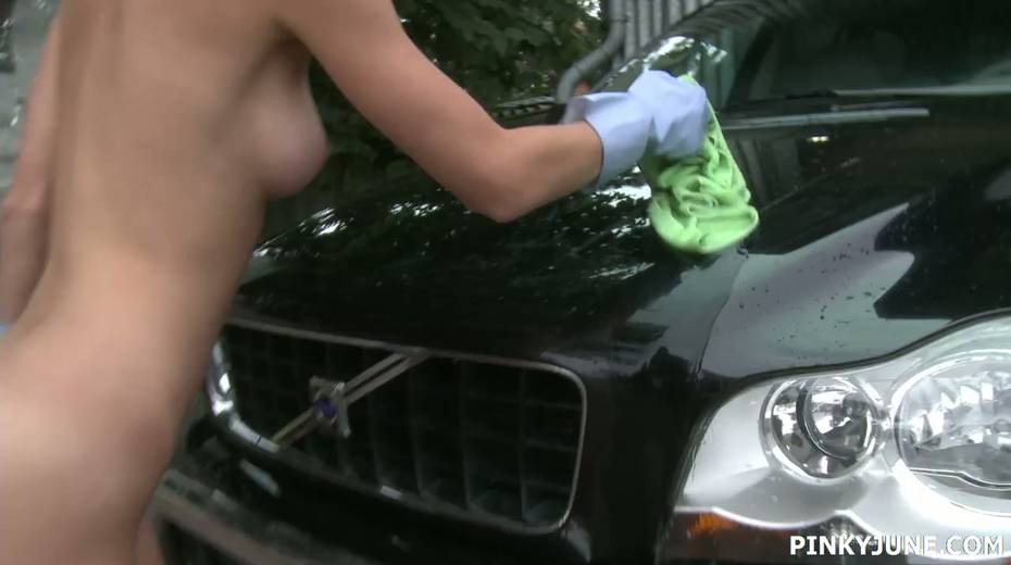 Slutty car washing babe Pinky June fucks herself outdoor