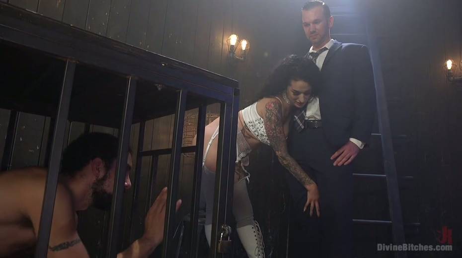 Big tittied mistress Arabelle Raphael punishes two bisexual dudes