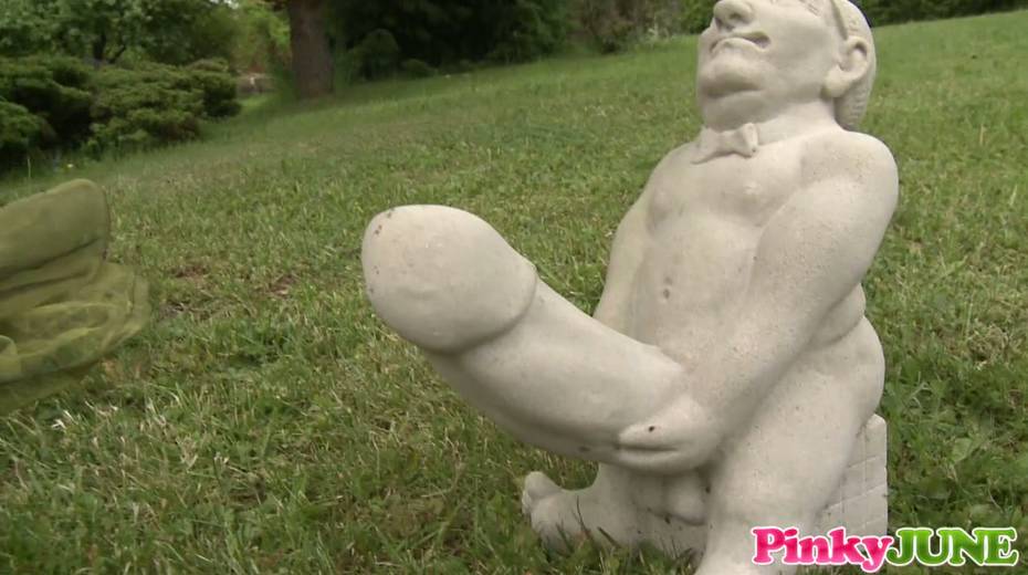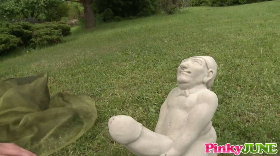 Young 18 yo blonde Pinky June is playing with her juicy pussy in the garden