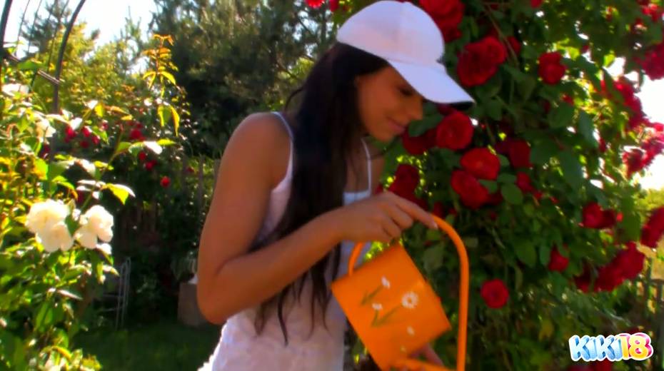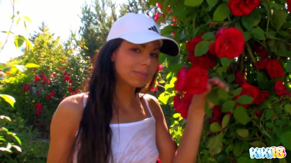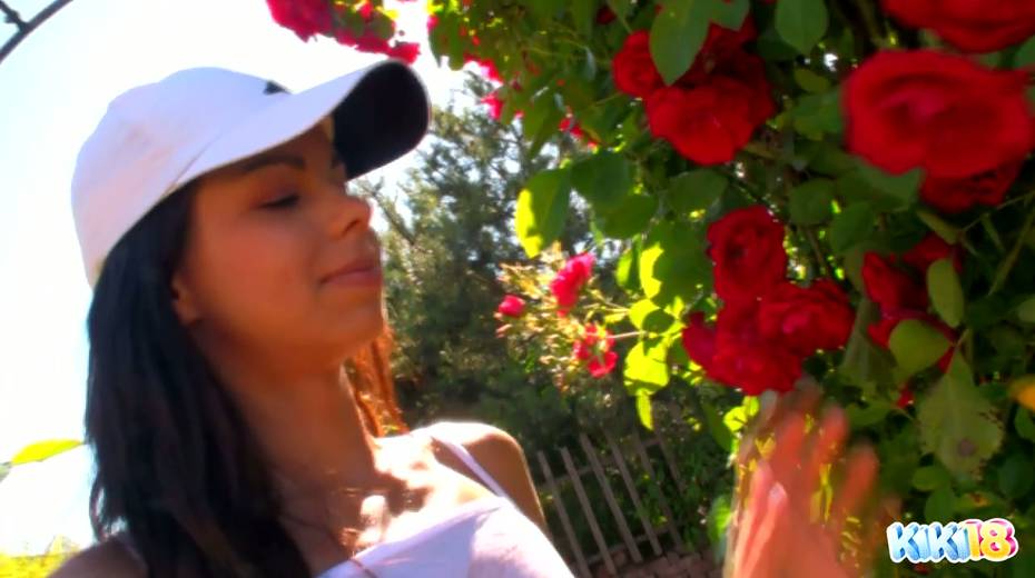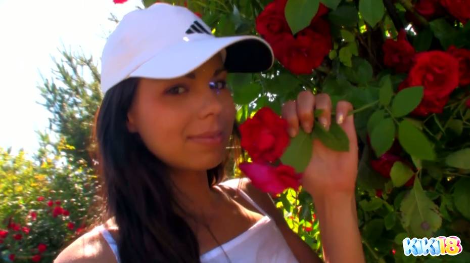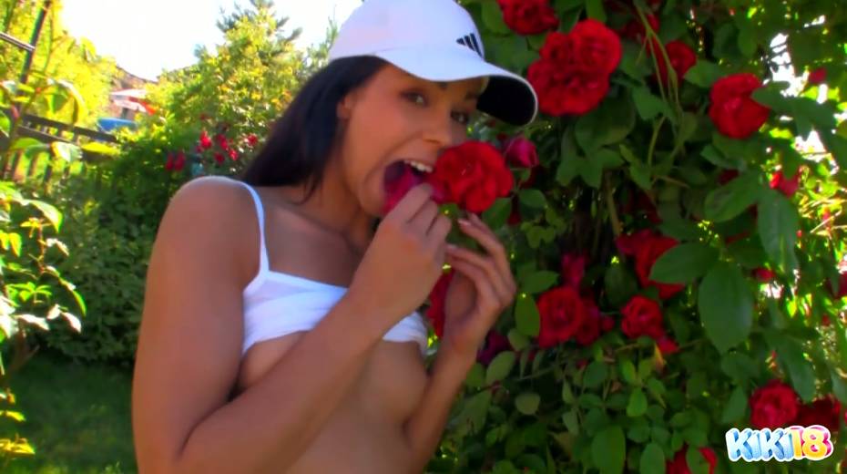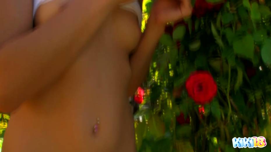 Young hottie Kiki takes off clothes and plays with pussy in the garden