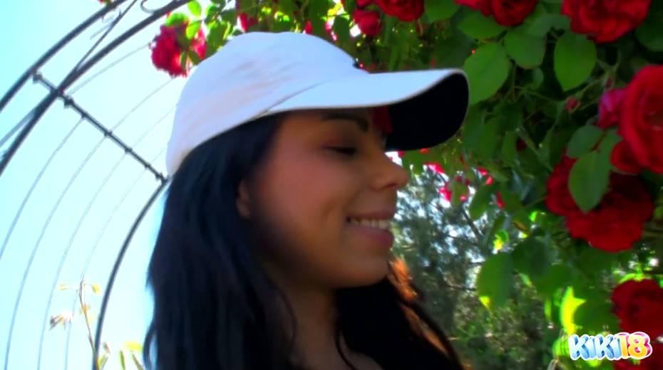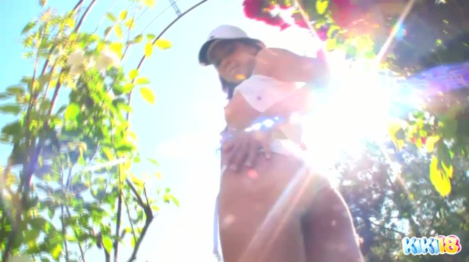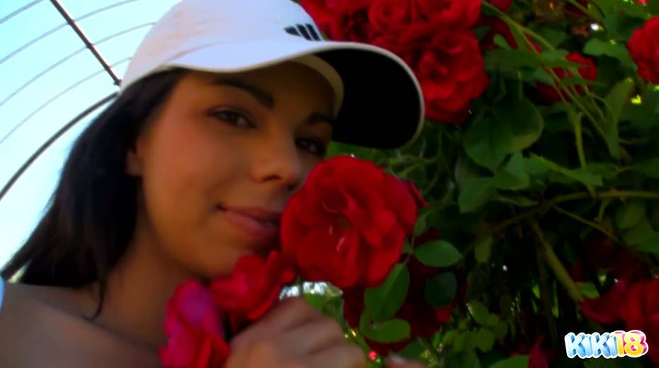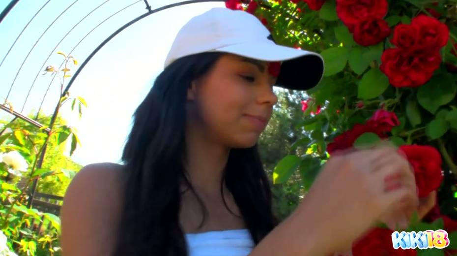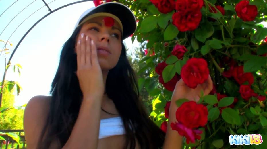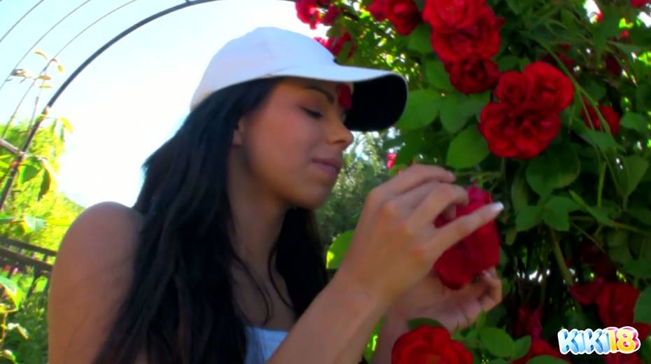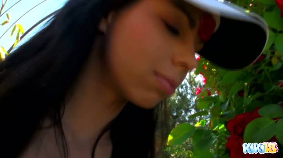 Young hottie Kiki takes off clothes and plays with pussy in the garden