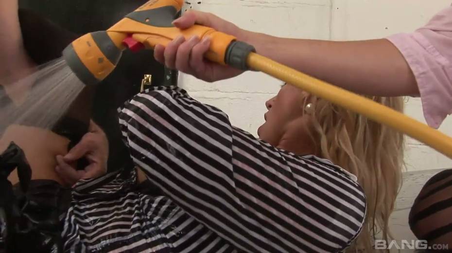 Delicious babes in wet blouses are fucked by one kinky stud in the shower