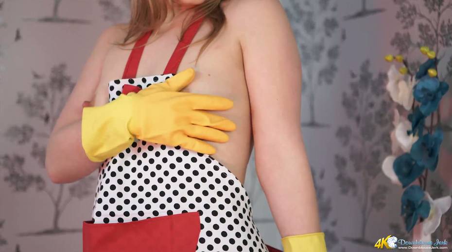 Nude housewife wearing only apron Aston Wilde is flashing her hard nipples