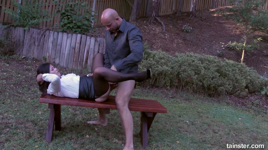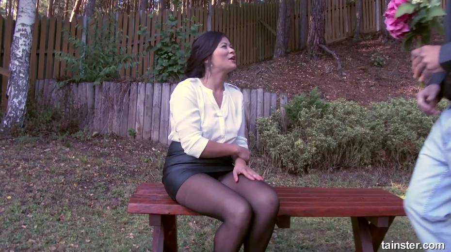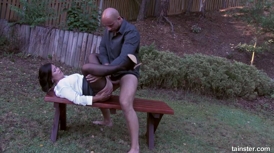 Clothed bitch Kara Magic takes cum on her pantyhose after crazy outdoor sex