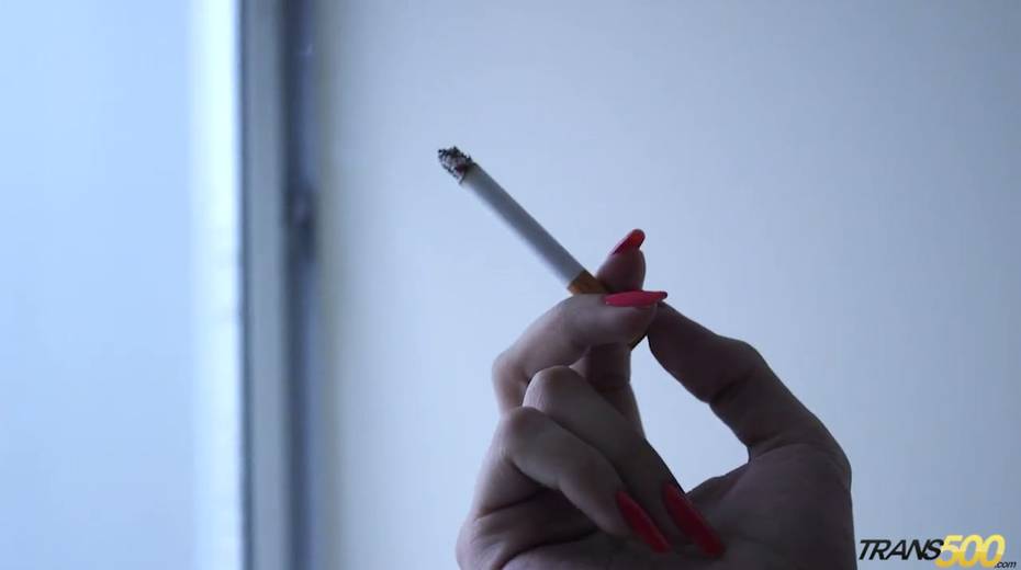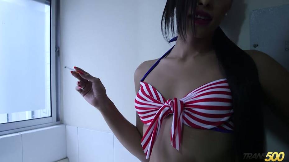 Smoking tranny Mariana Pink shows her perky tits and dick