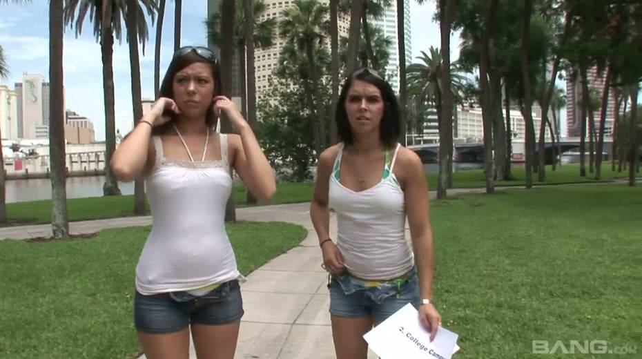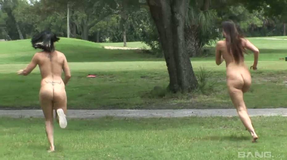 Two spoiled nude chicks are running on the lawn in broad daylight