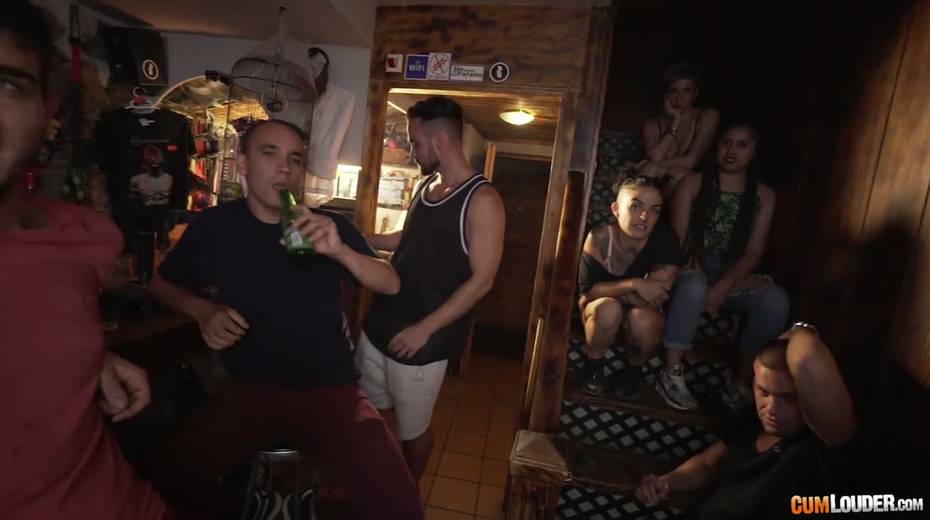Group of punk dudes fucks two naughty chicks on the bar counter