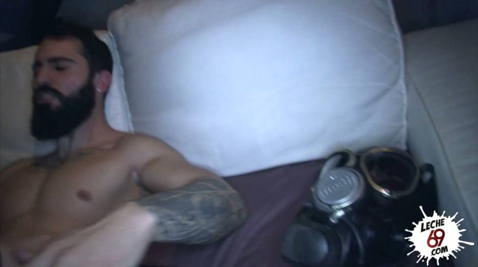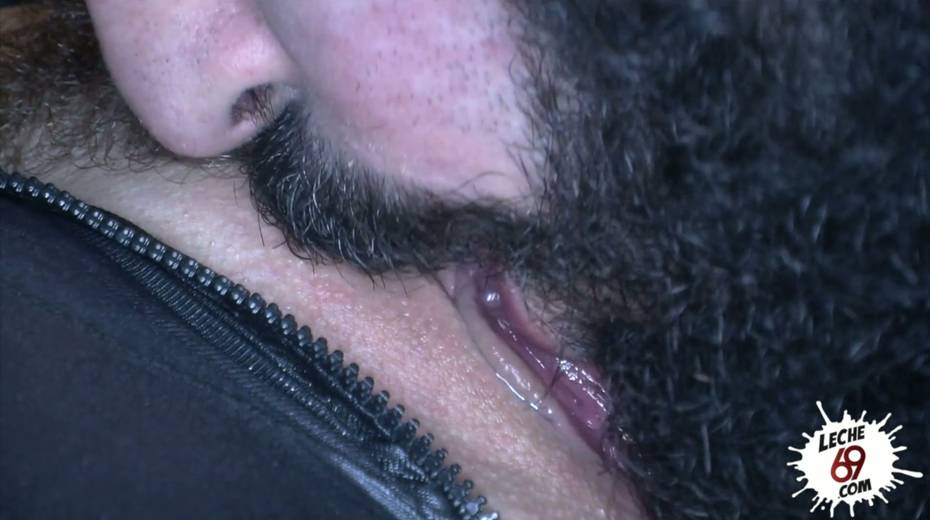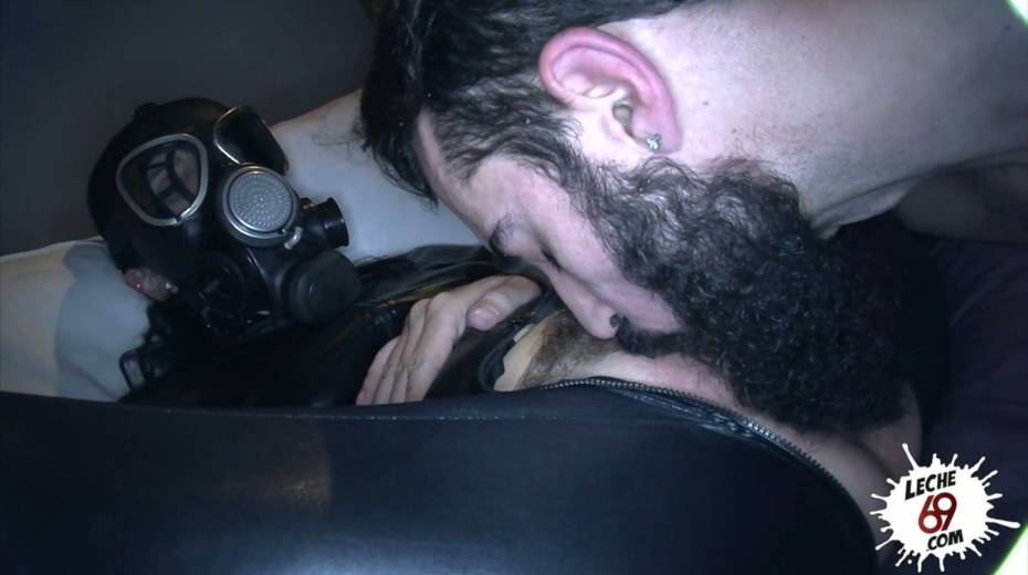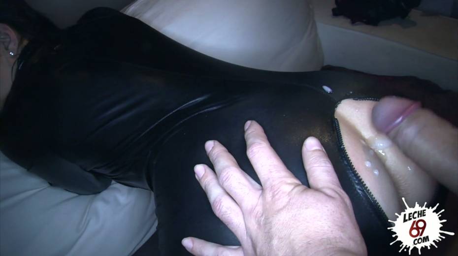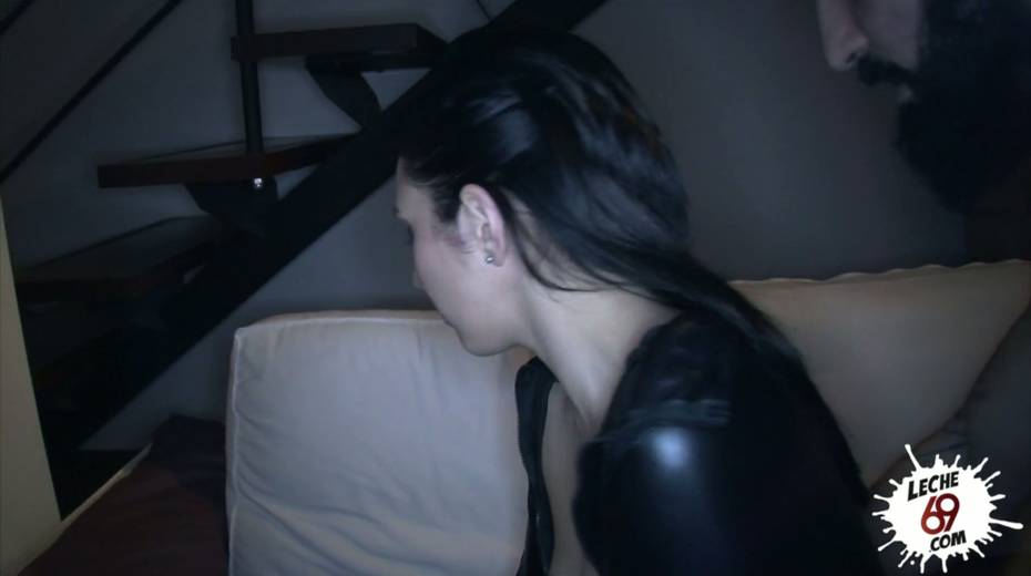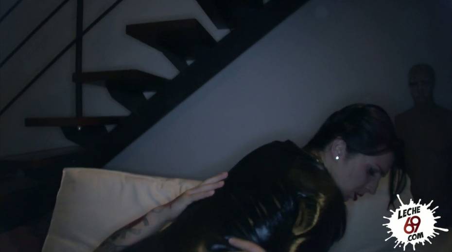 Mistress wearing latex crotchless outfit is fucked hard by one bearded guy