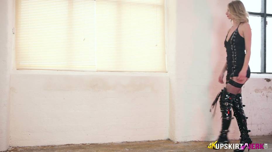 Slender babe in latex high boots Leah shows upskirt and her pretty hot pussy
