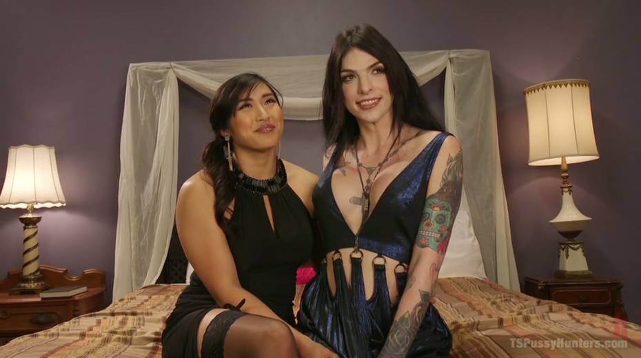 Tied up brunette is fucked hard by tattooed tall tranny Chelsea Marie