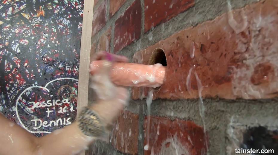 Slut enjoys taking gallons of fake sperm in the glory hole room