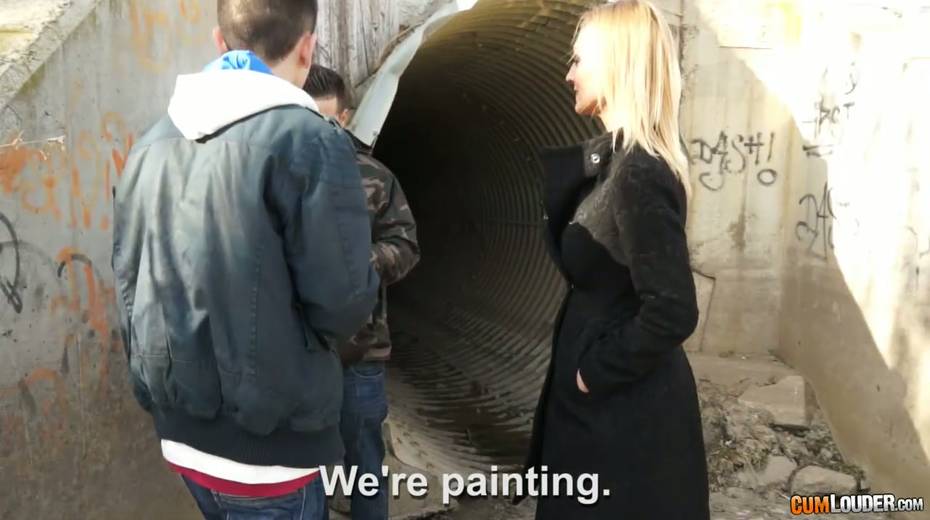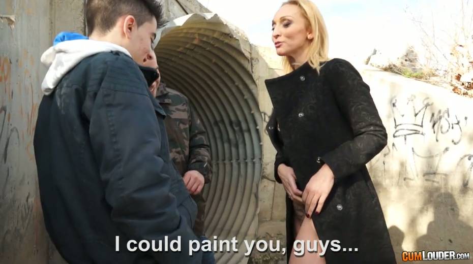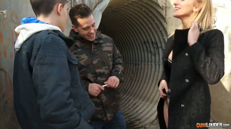 Seductive hoochie Daniela Evans seduces two horny guys outdoor