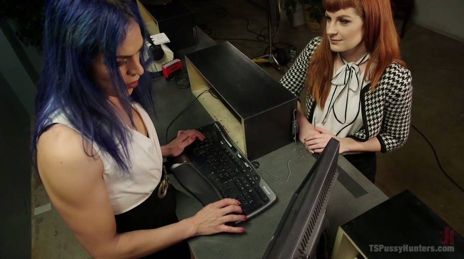 Red haired bitch Barbary Rose gives her head to shemale boss