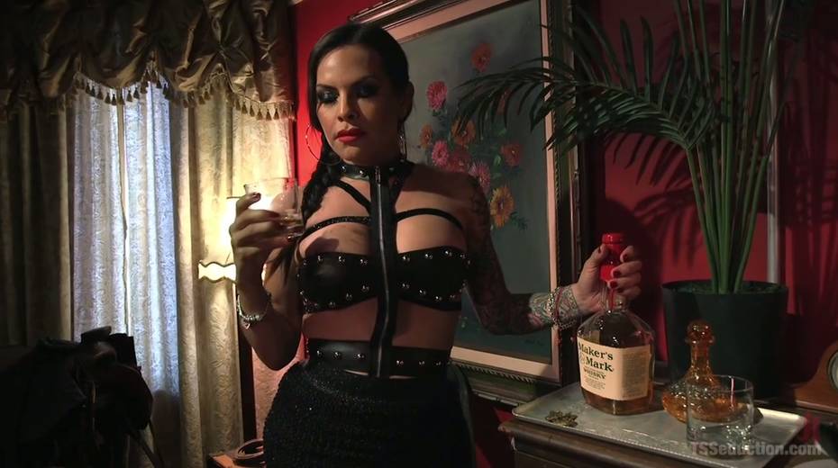 Tranny in leather outfit Foxxy fucks anal hole of one submissive dude