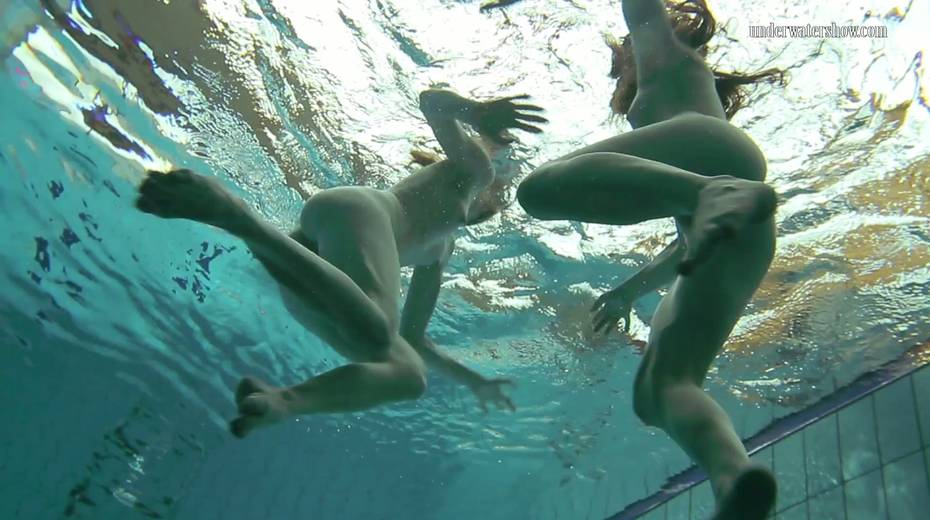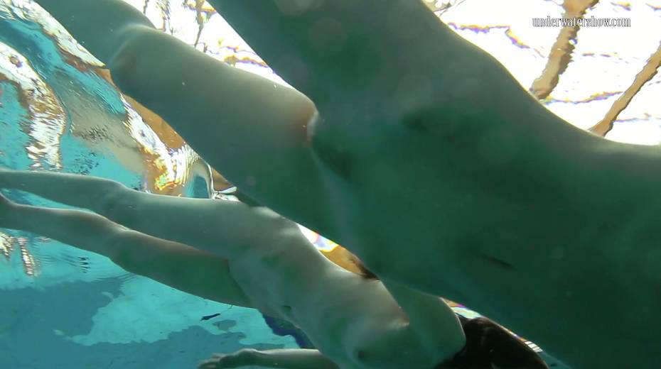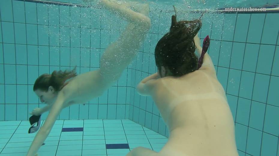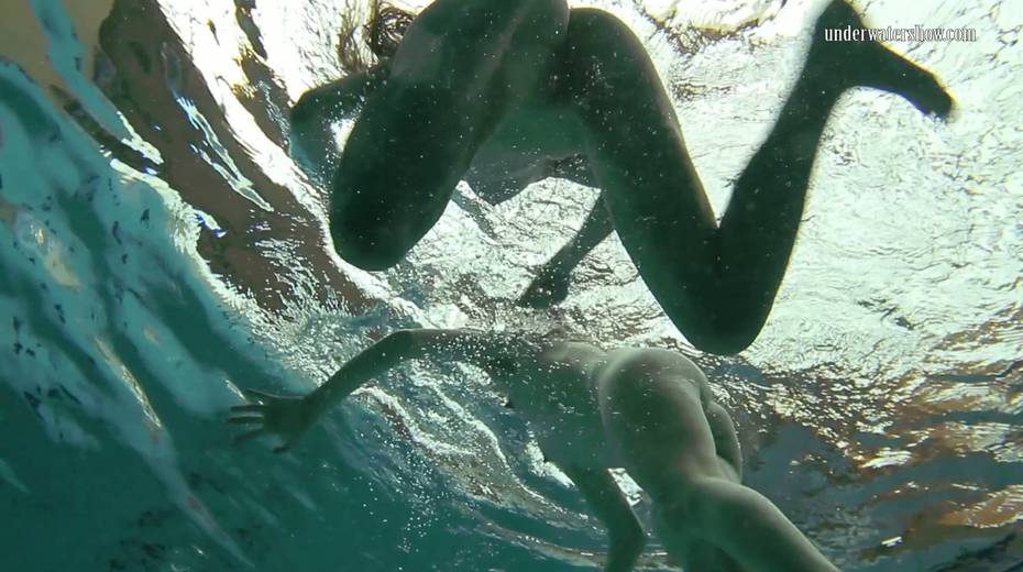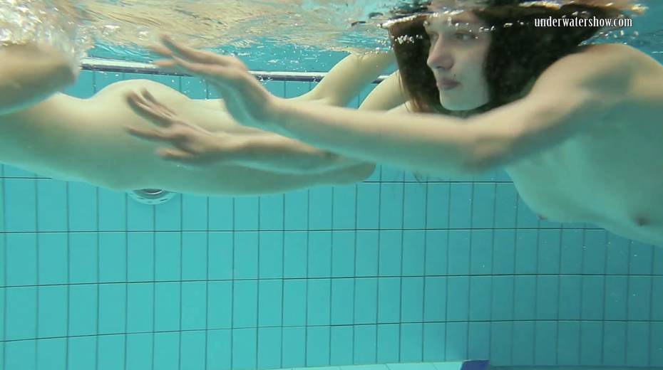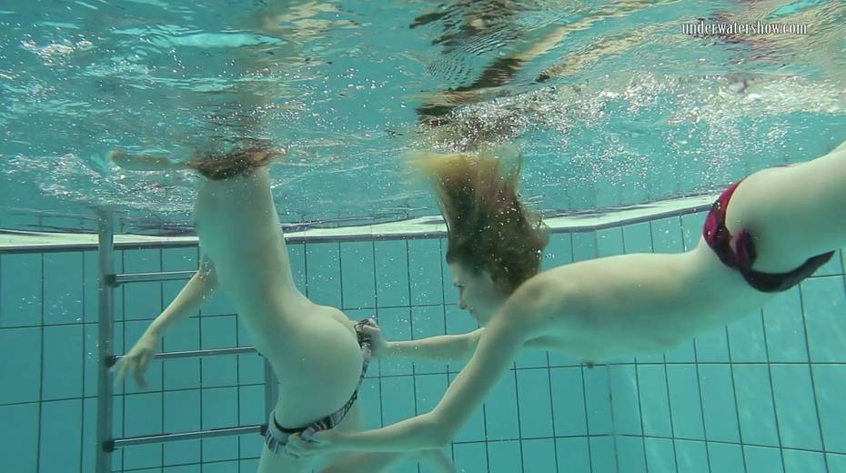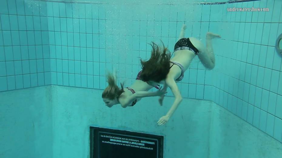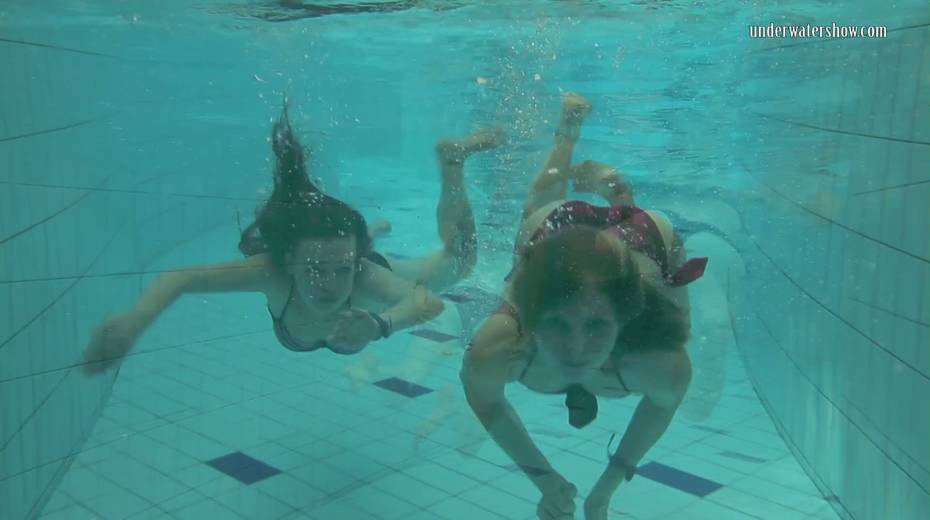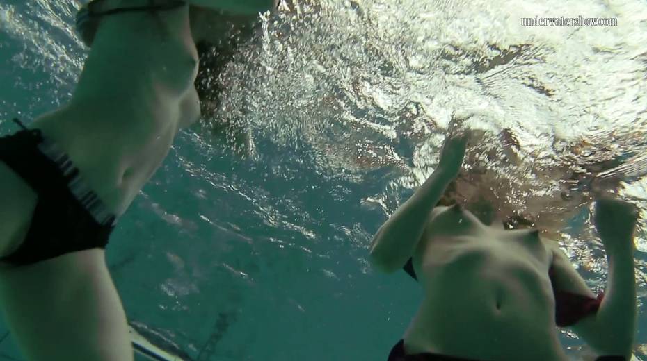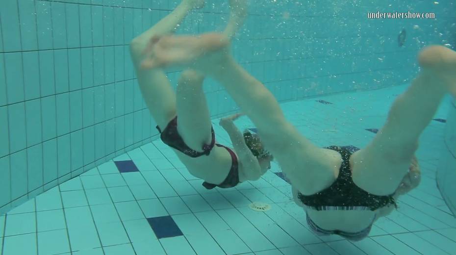 Two swimming babes undress under the water and do tricks