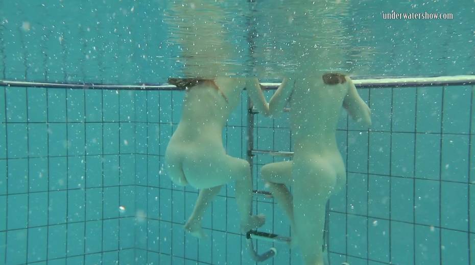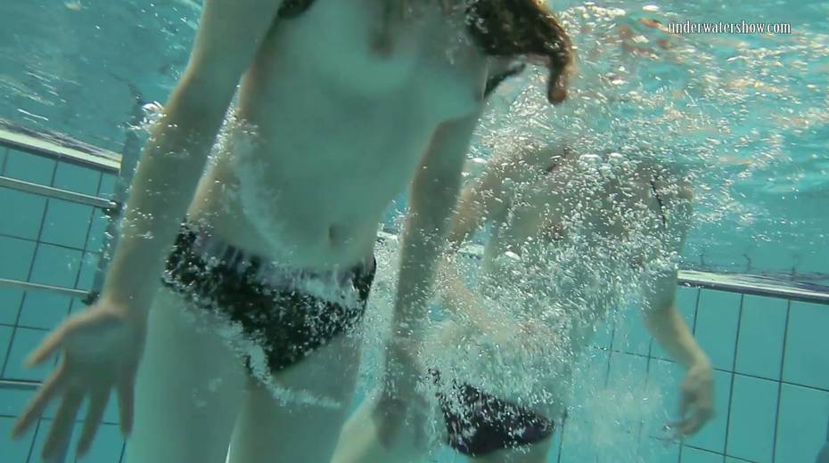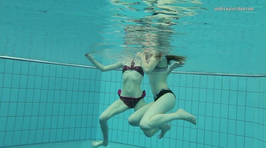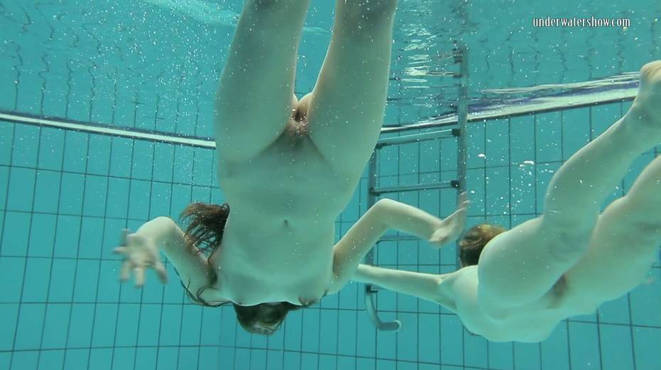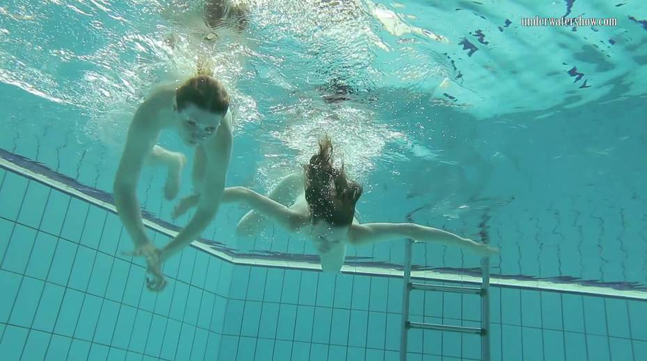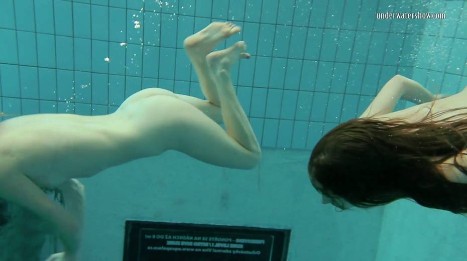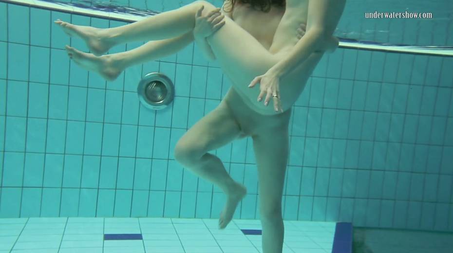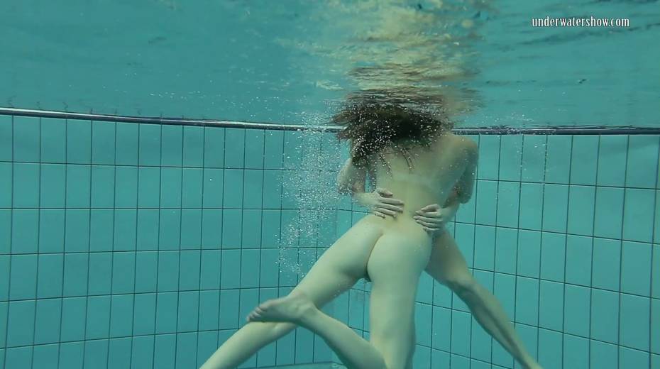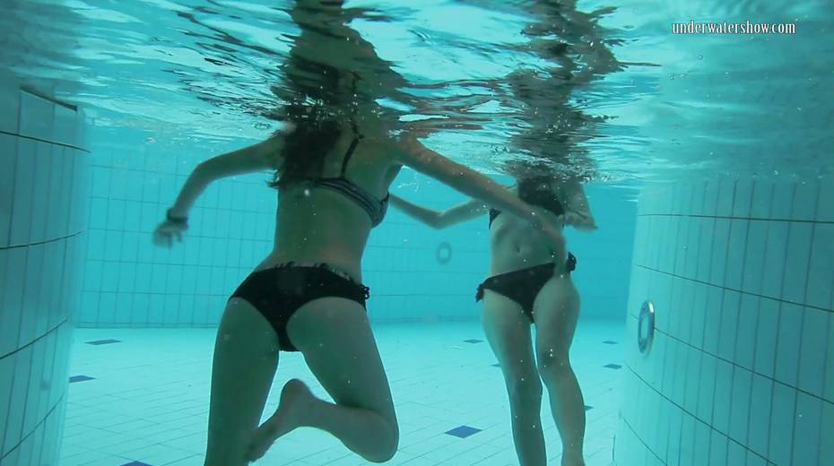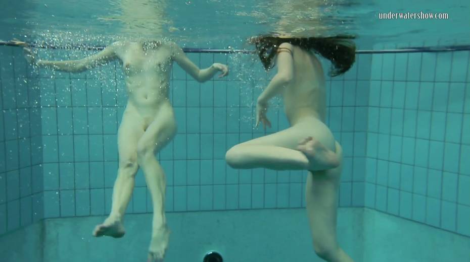 Two swimming babes undress under the water and do tricks