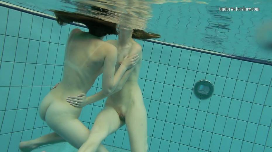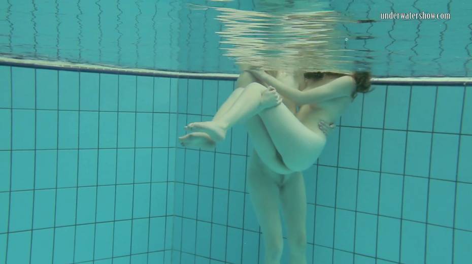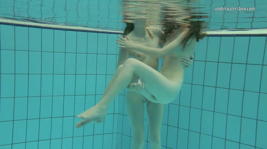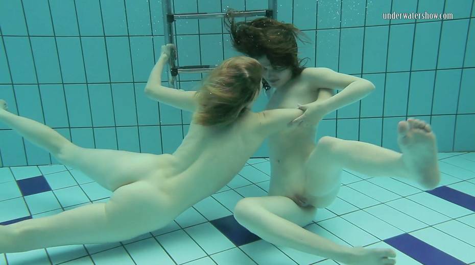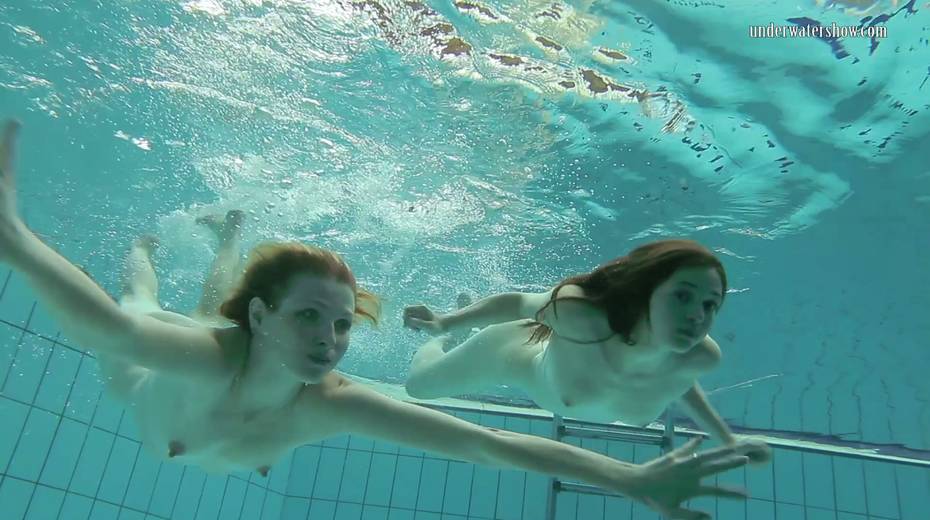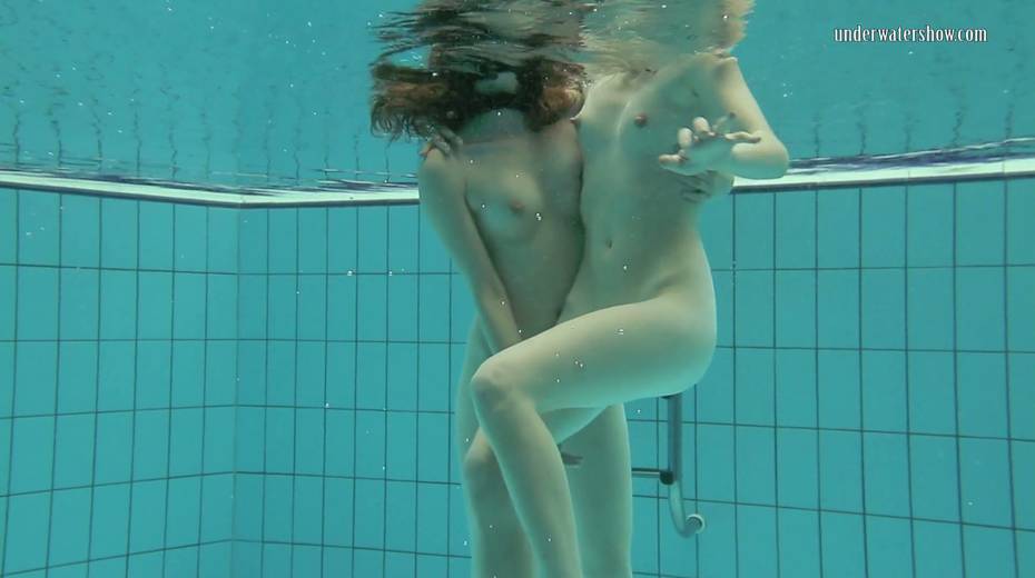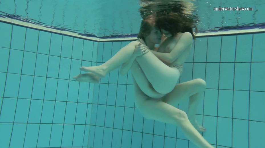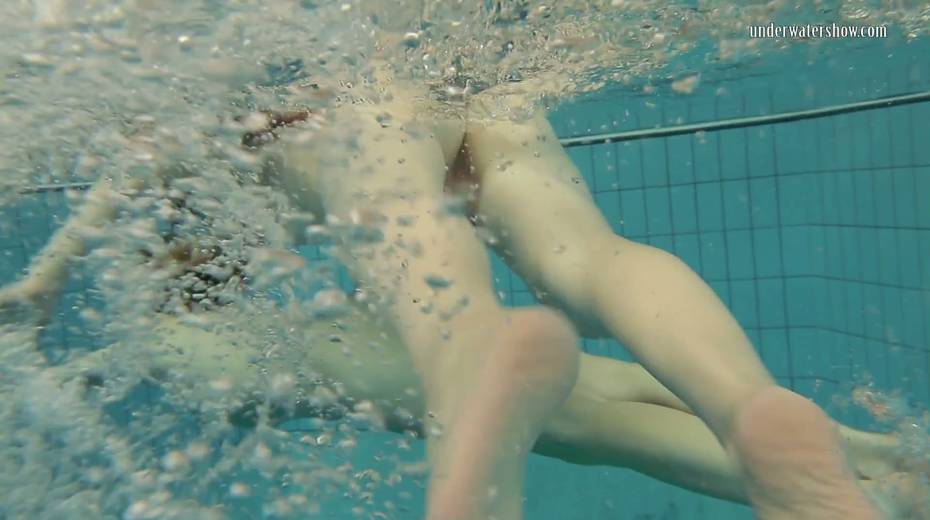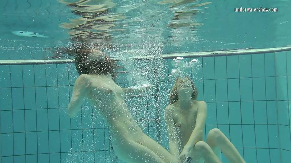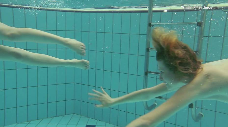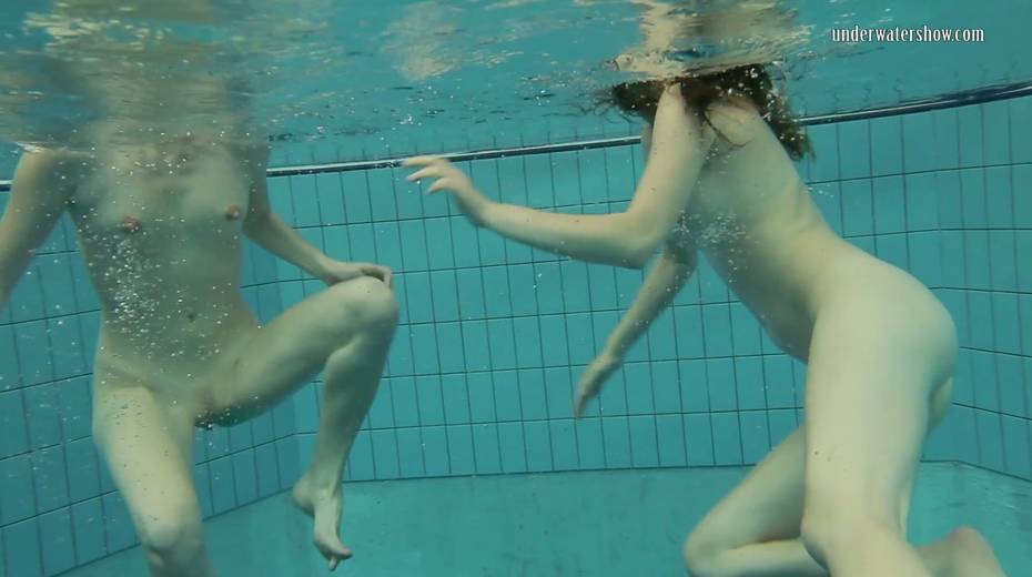 Two swimming babes undress under the water and do tricks