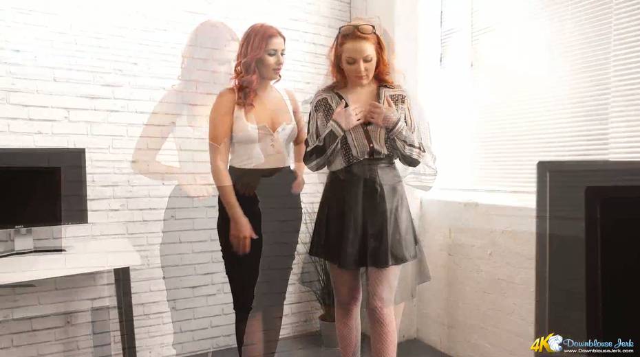 Two yummy babes show off their juicy big natural tits