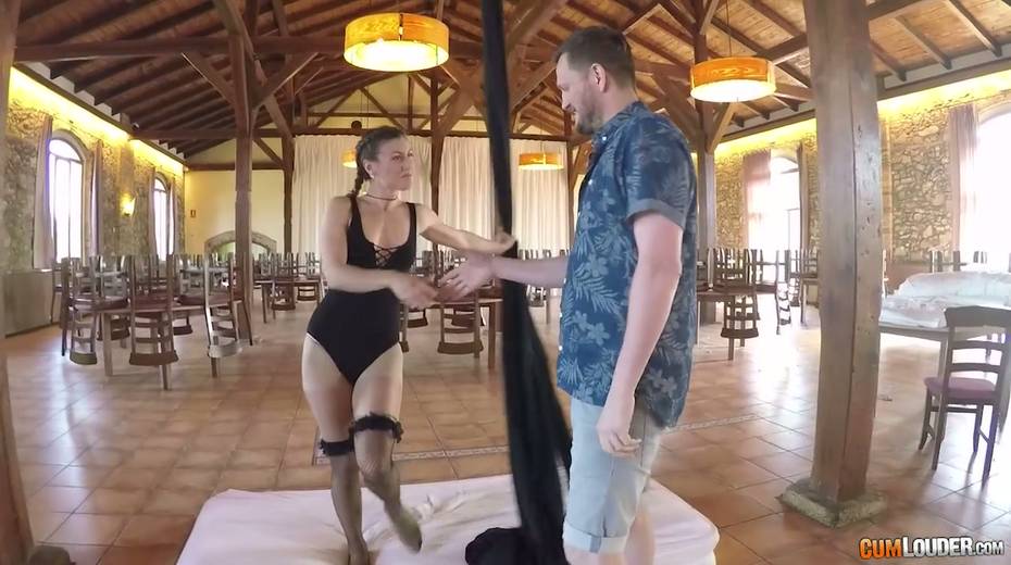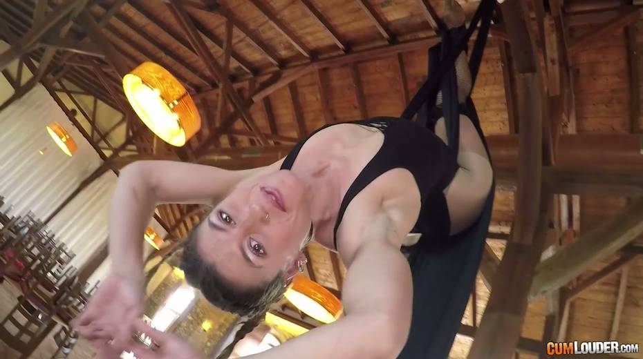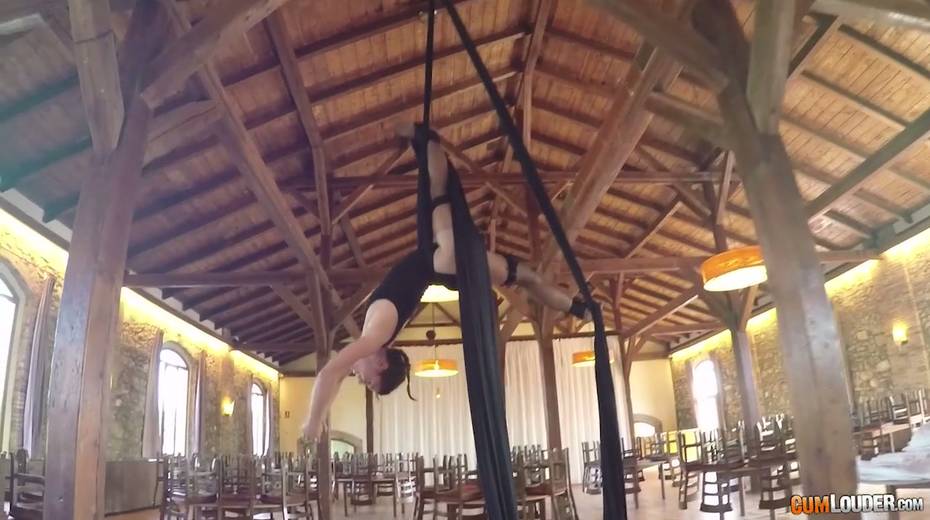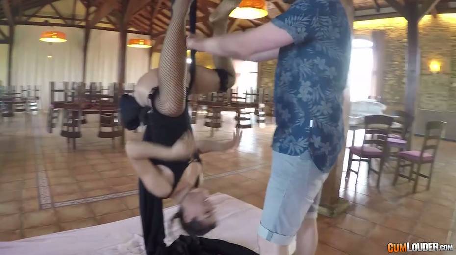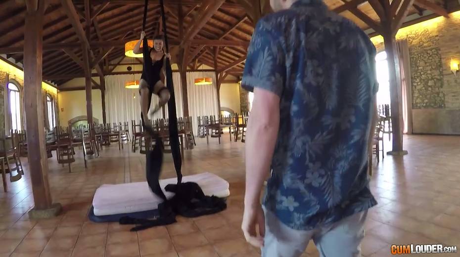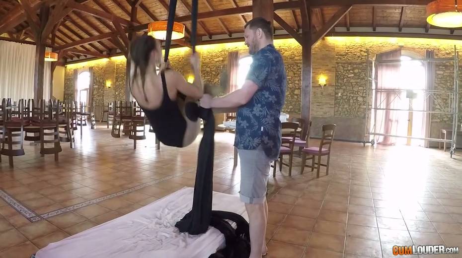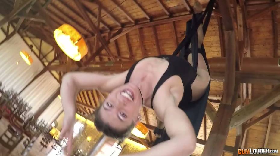 Flying yoga babe Julia Roca is face fucked and fucked in aerial yoga hammock