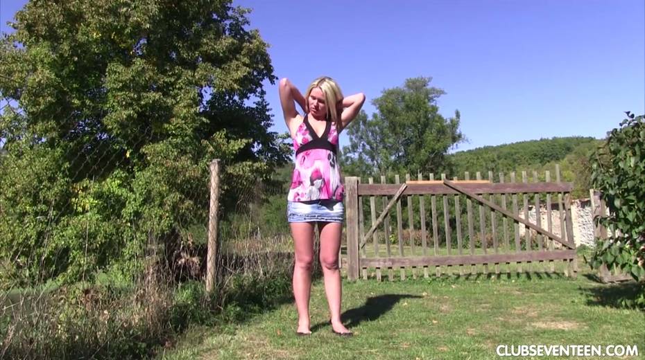 19 yo blondie Claudia is fingering her horny hole right on the grass