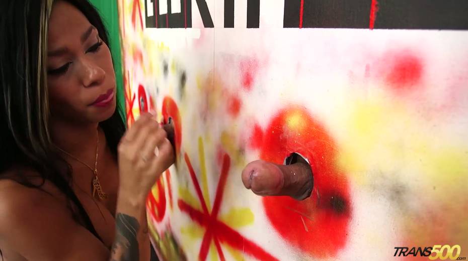 Tanned and big tittied ladyboy Tatiana Guzman sucks several dicks in the glory hole room