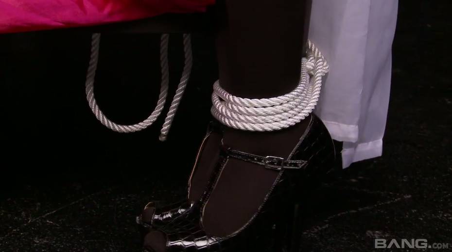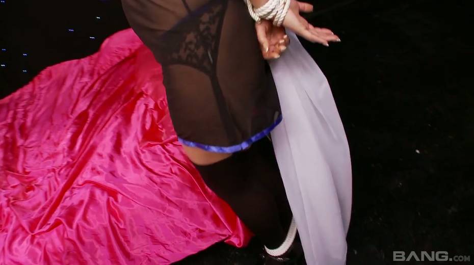 Two tied up lesbians with ball gags in their mouths try to make each other free