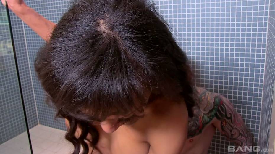 Slutty chick Alyssa Divine shows her foamed ass and gives blowjob in the shower