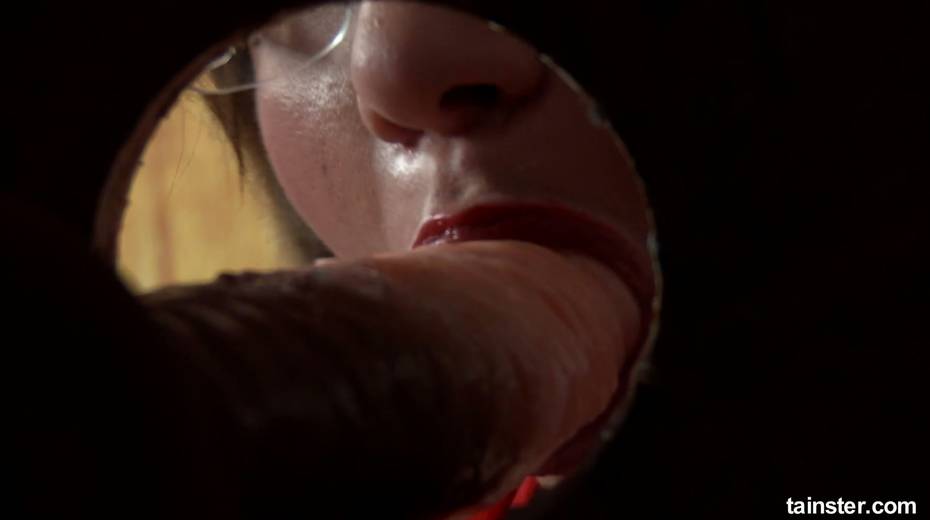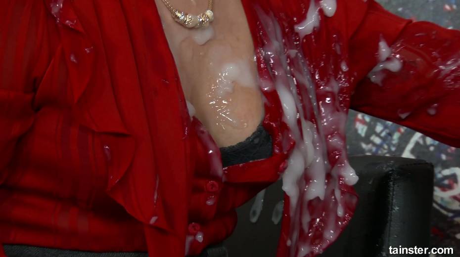Slutty chick in glasses is covered with a n abundance of fake cum