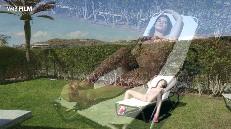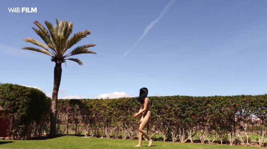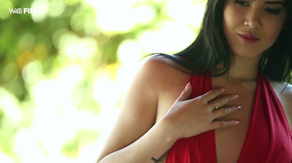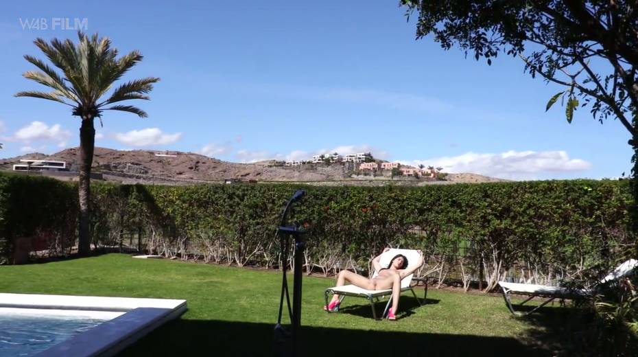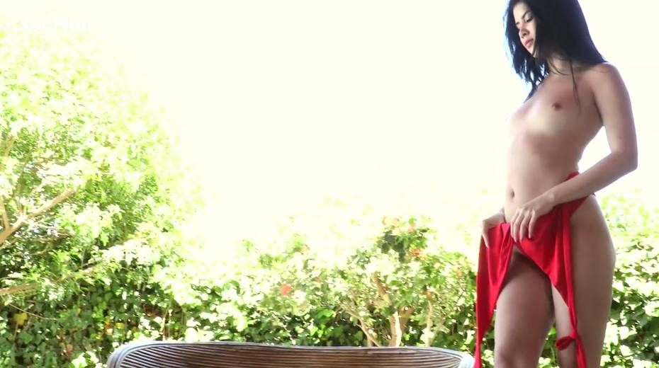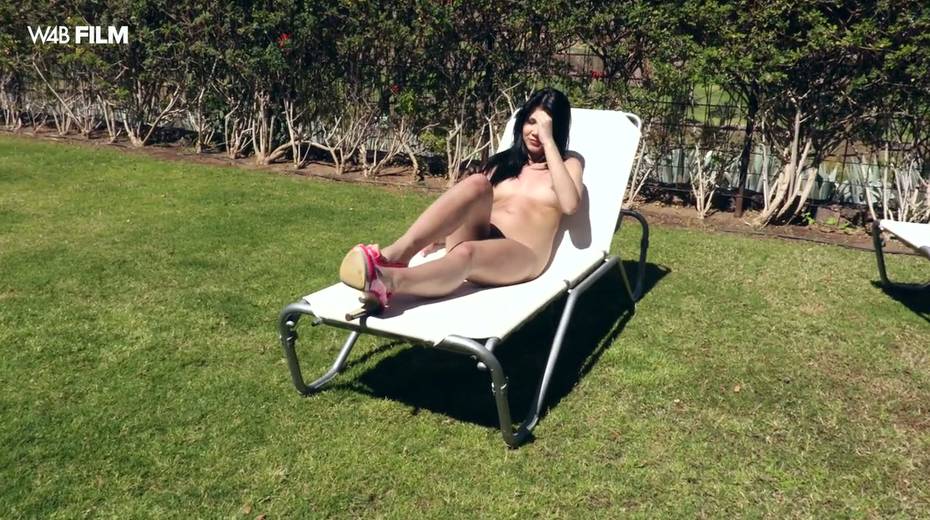 Tempting brunette Lady Dee enjoys playing with her pussy in the garden