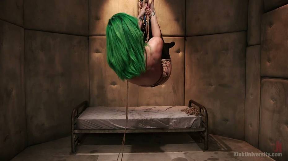 Suspended green haired actress is playing with her crazy cunt